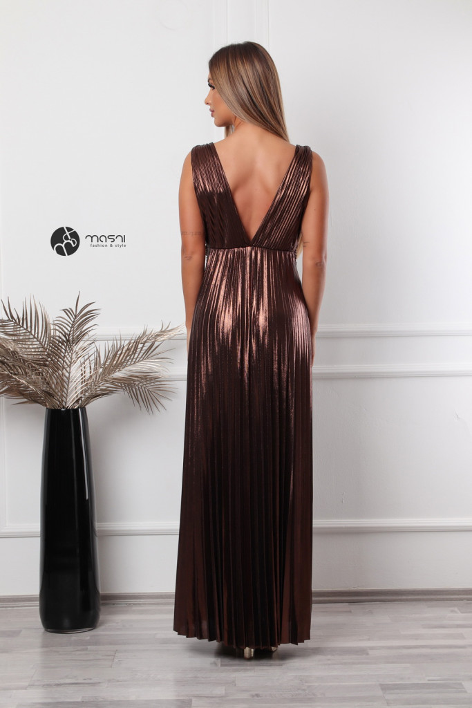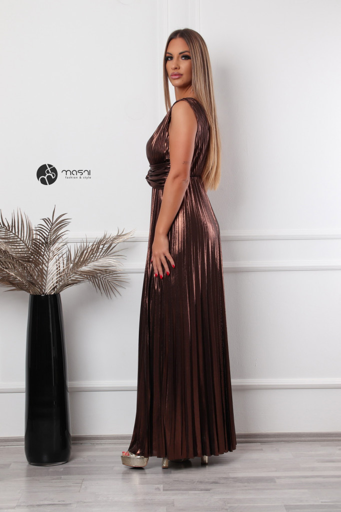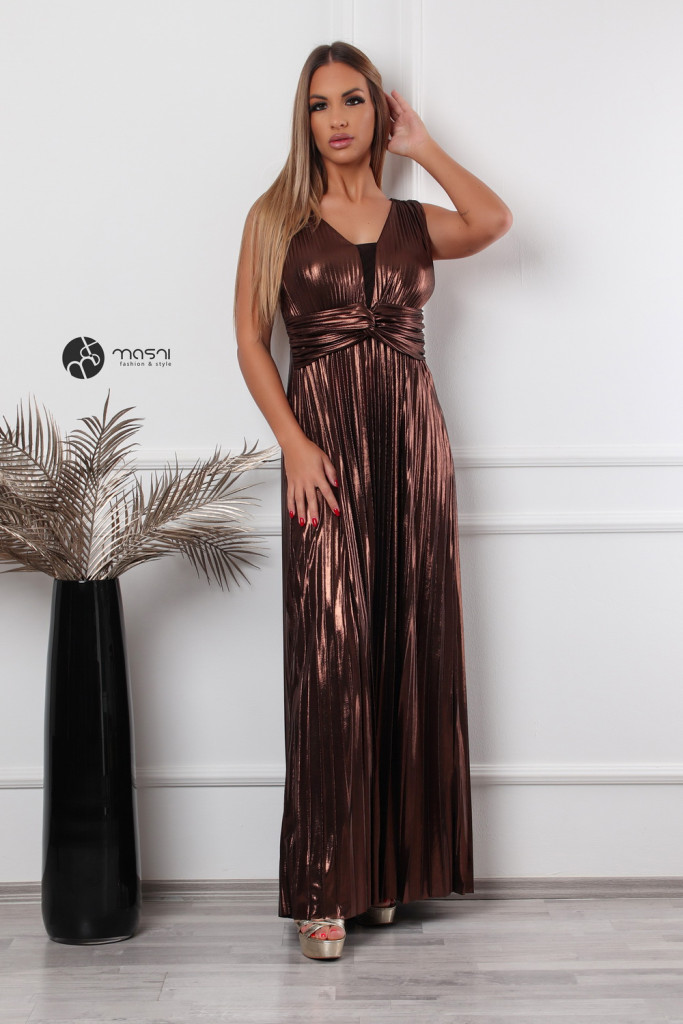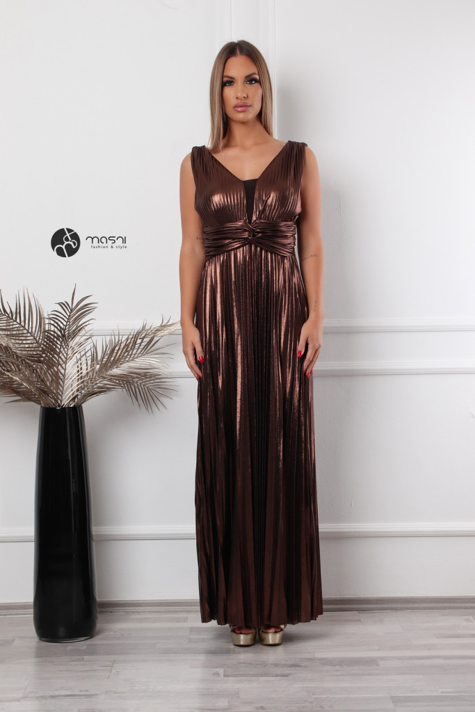Elől - hátul V nyakú, elől mellnél necc betétes, mell alatt csavart, anyagában csillogó pliszírozott maxi ruha