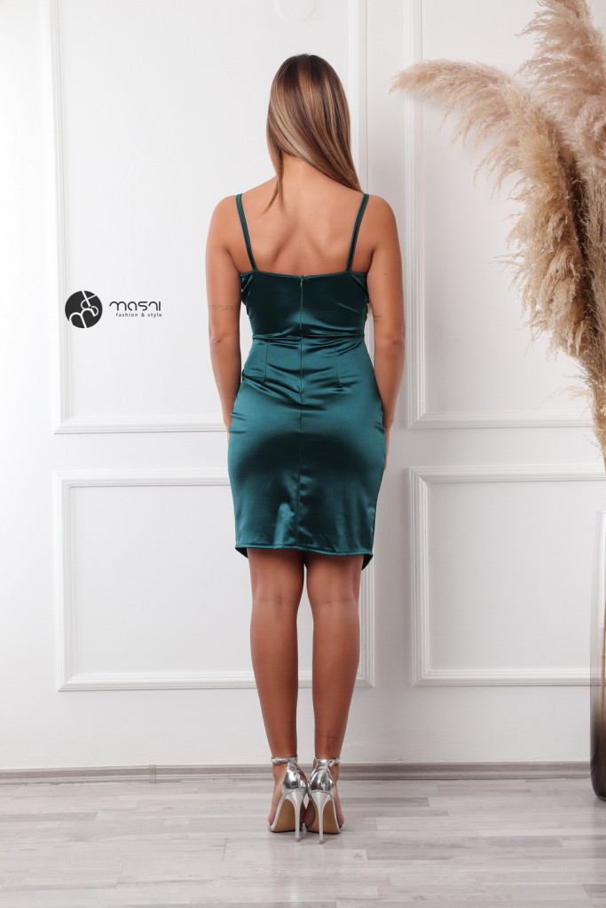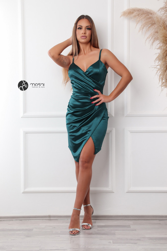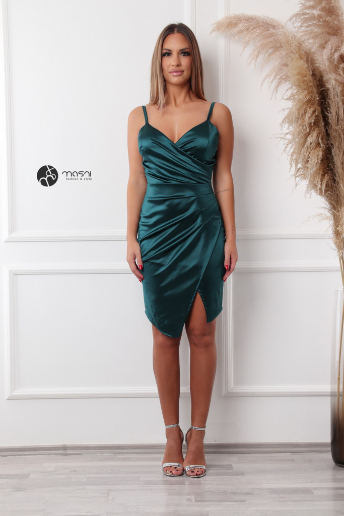 Ujjatlan, átlapolt, dekoltált, pántos, egyszínű alakkövető szatén miniruha