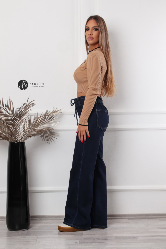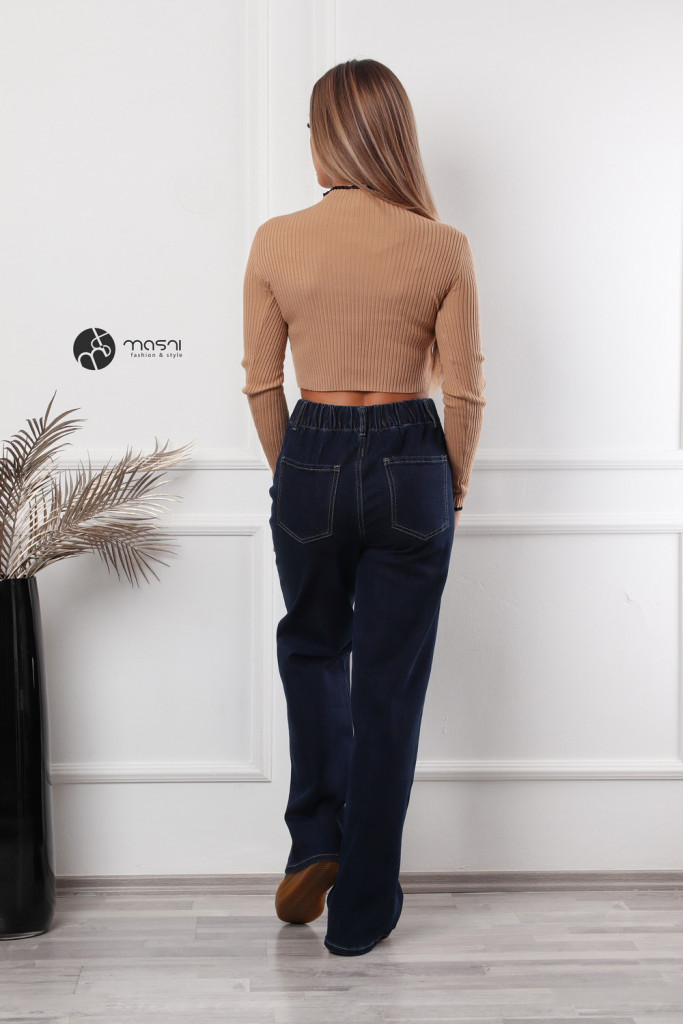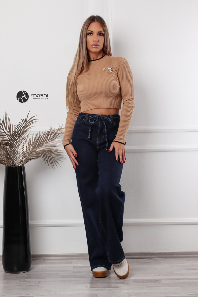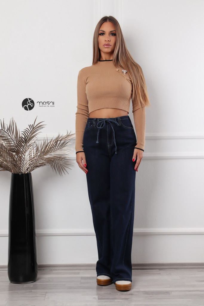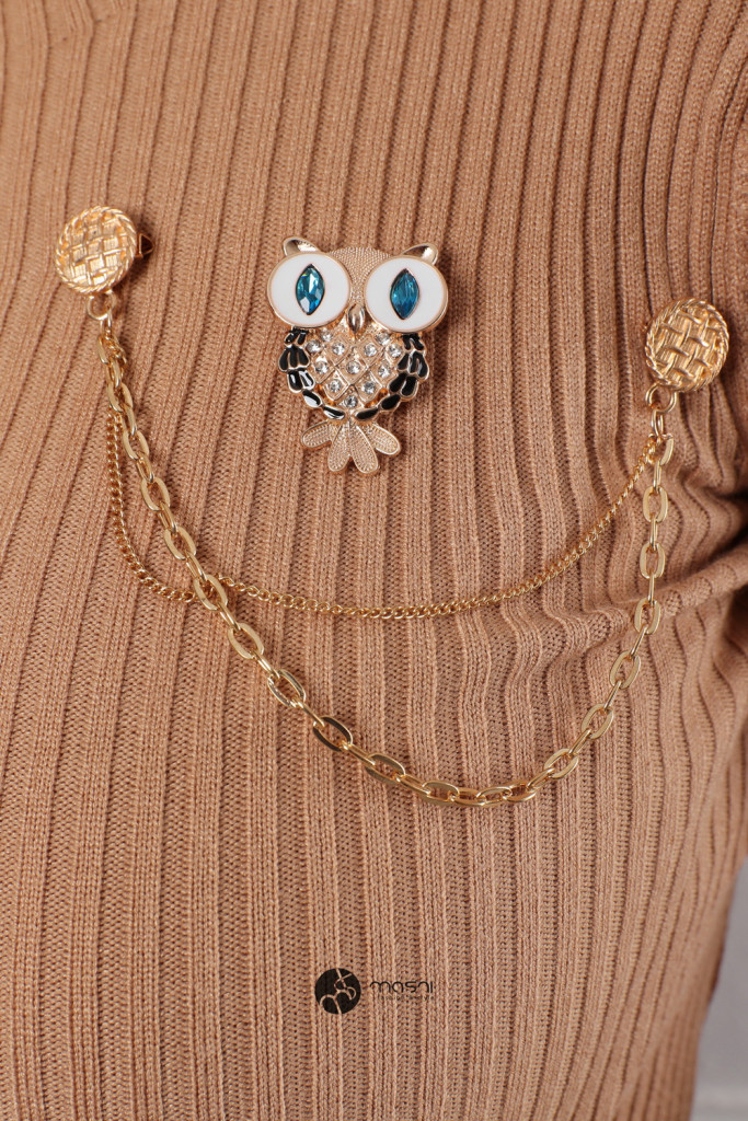 Magas nyakú, hosszú ujjú, rövid derekú, kötött egyszínű felső baglyos és arany láncos kitűzővel