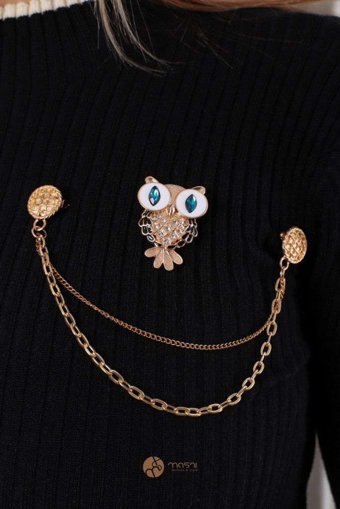 Magas nyakú, hosszú ujjú, rövid derekú, kötött egyszínű felső baglyos és arany láncos kitűzővel