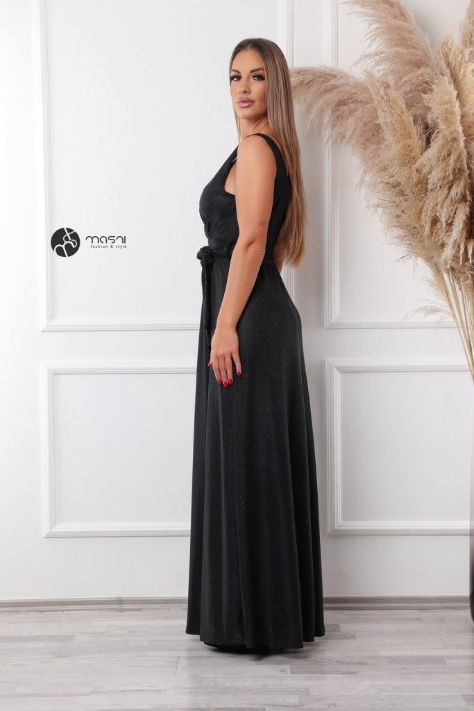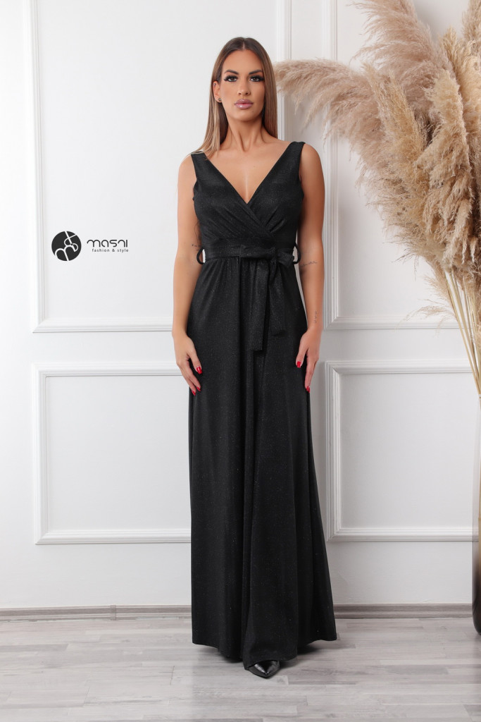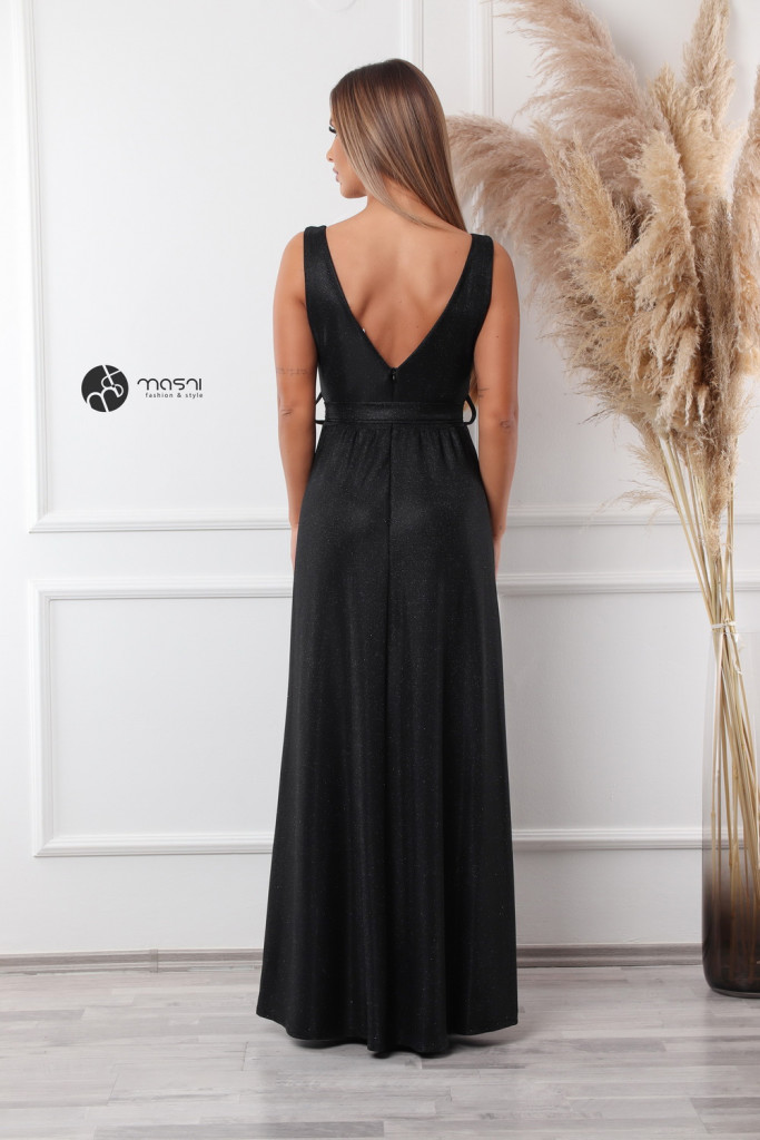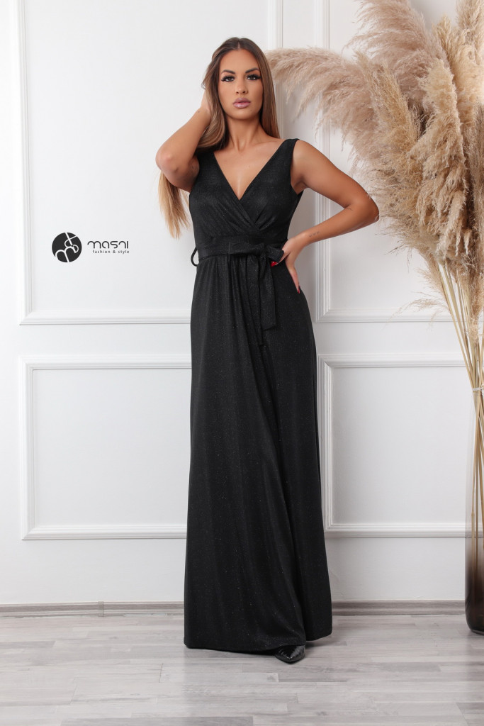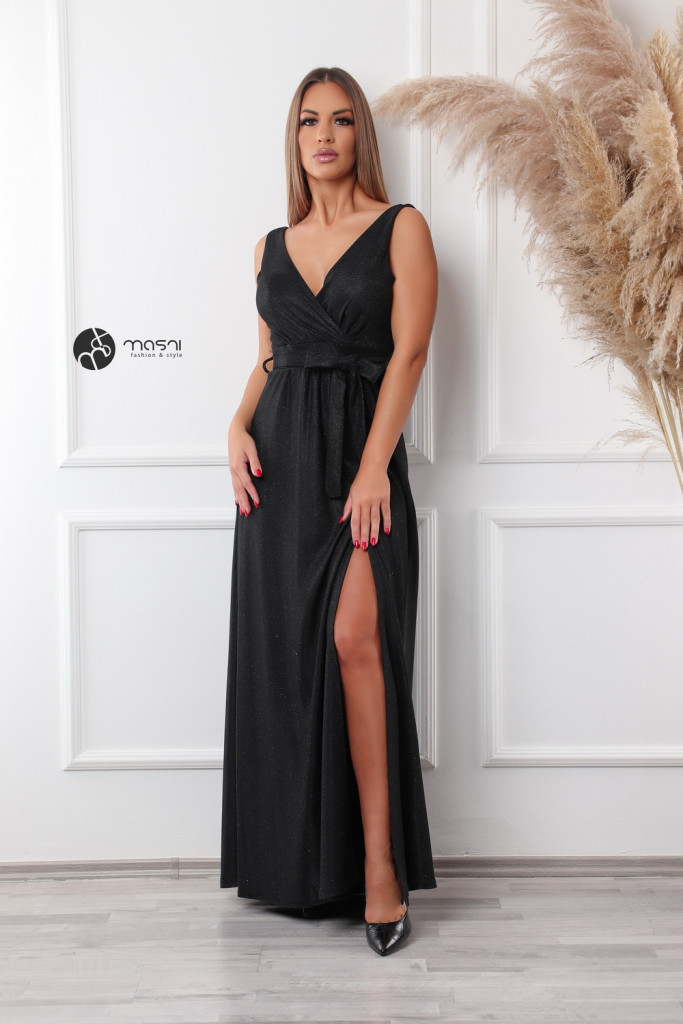 Ujjatlan, átlapolt felsőrészes, dekoltált, szoknya részen sliccelt, anyagában csillogó maxi ruha övvel
