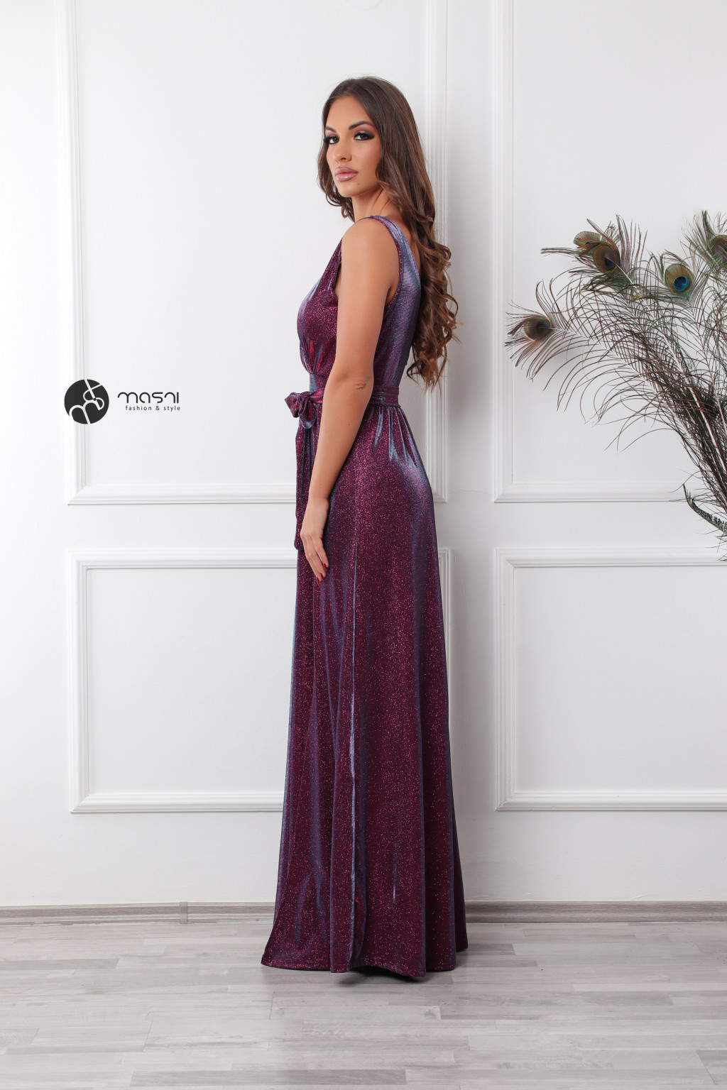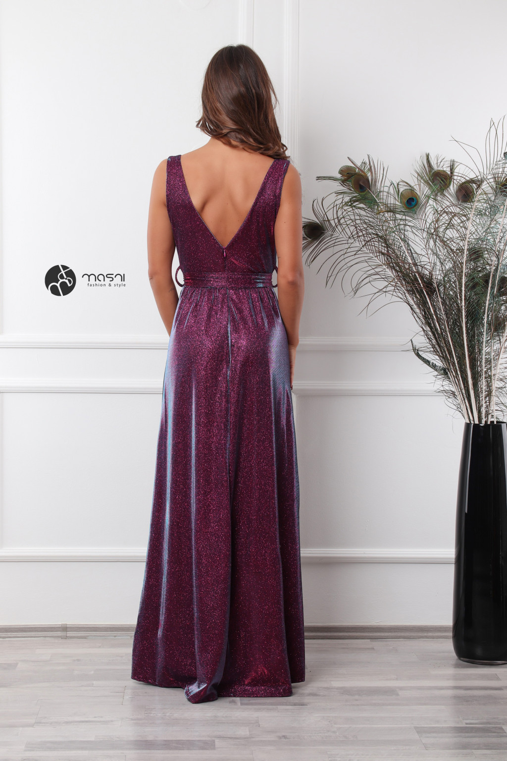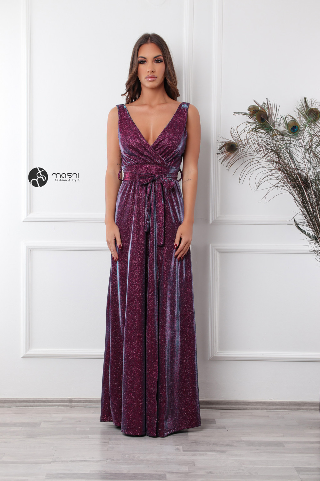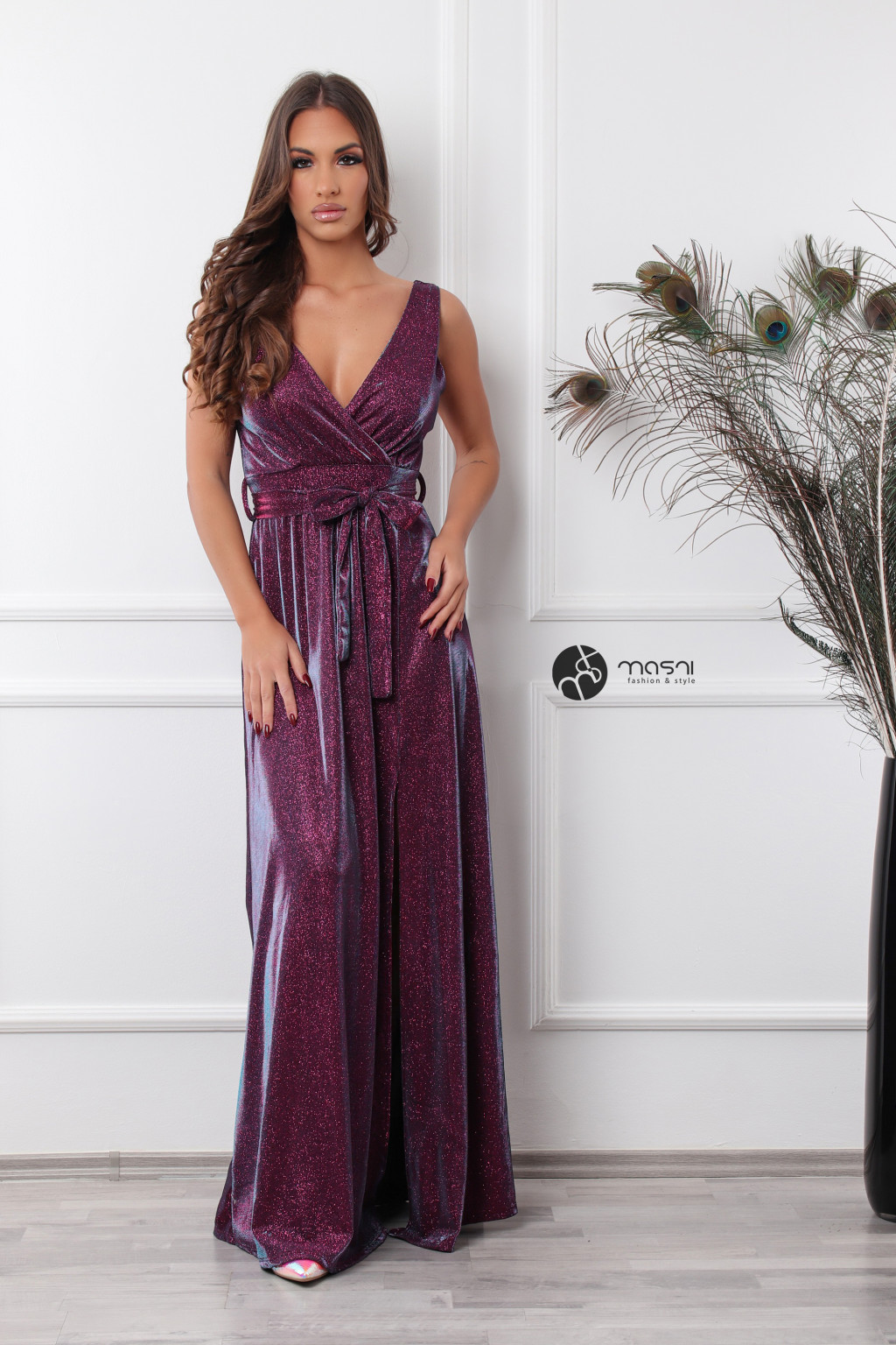 Ujjatlan, átlapolt felsőrészes, dekoltált, szoknya részen sliccelt, anyagában csillogó maxi ruha övvel