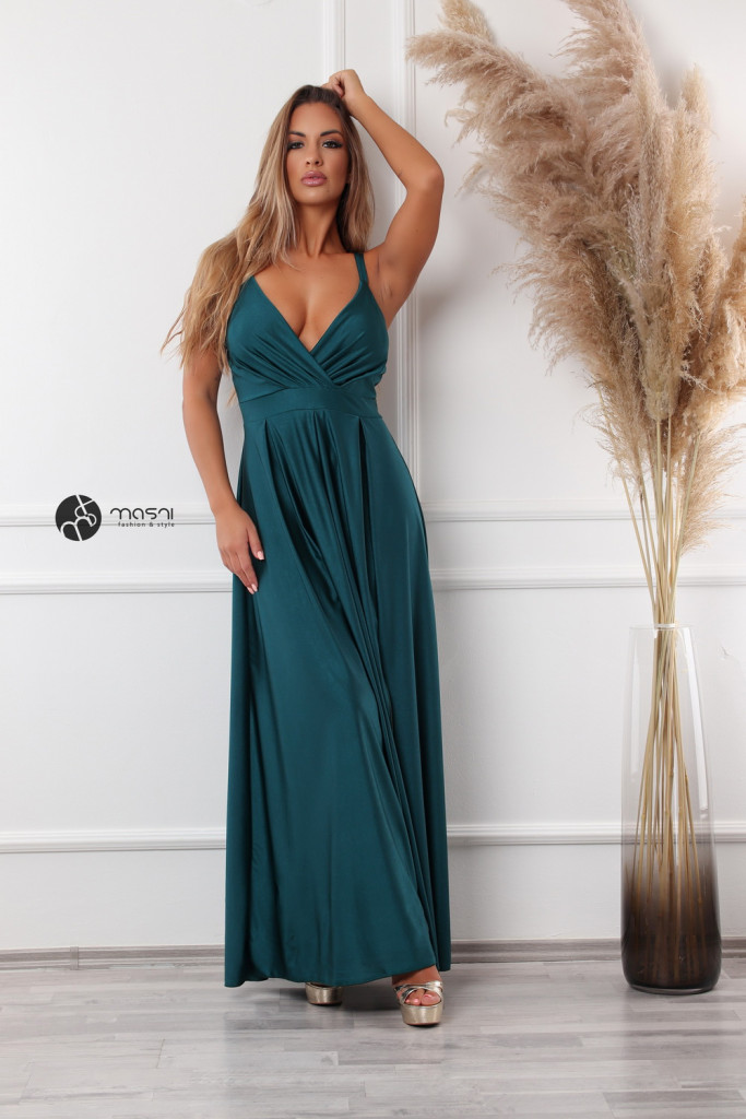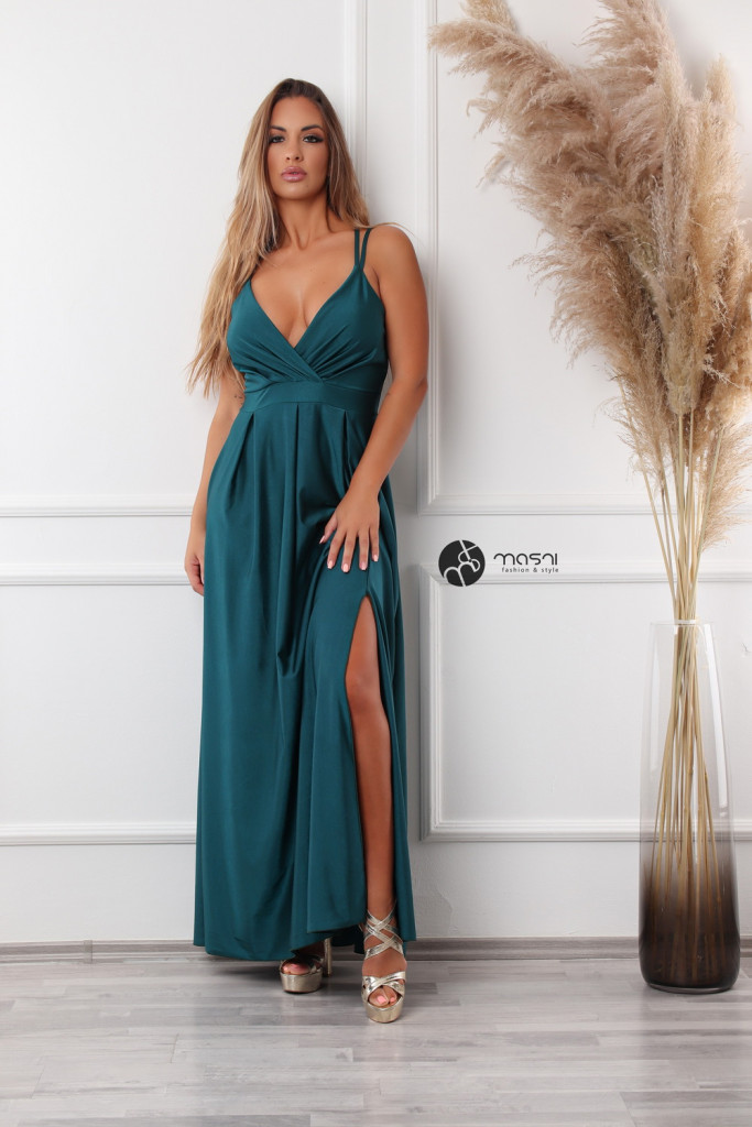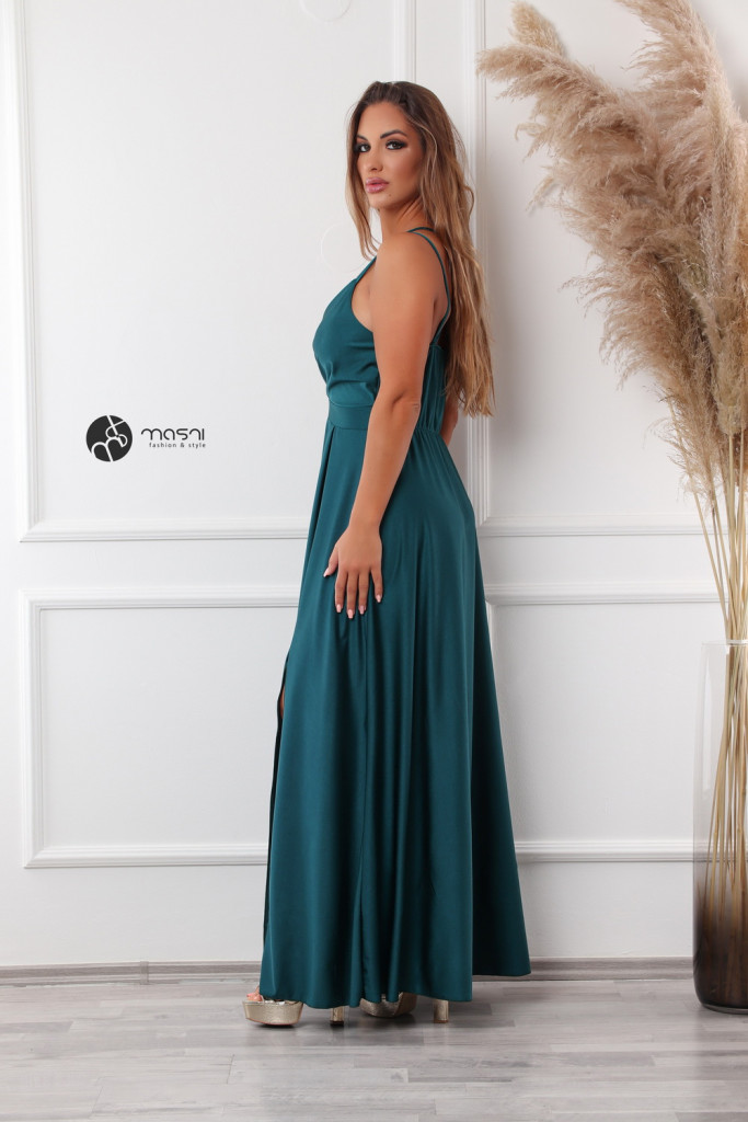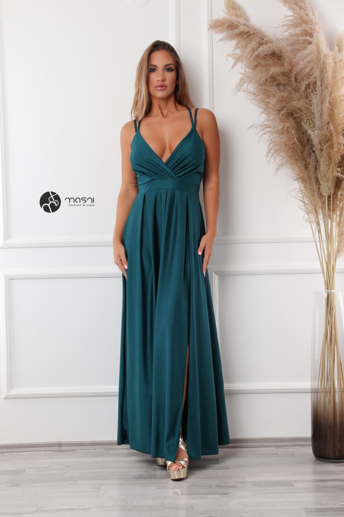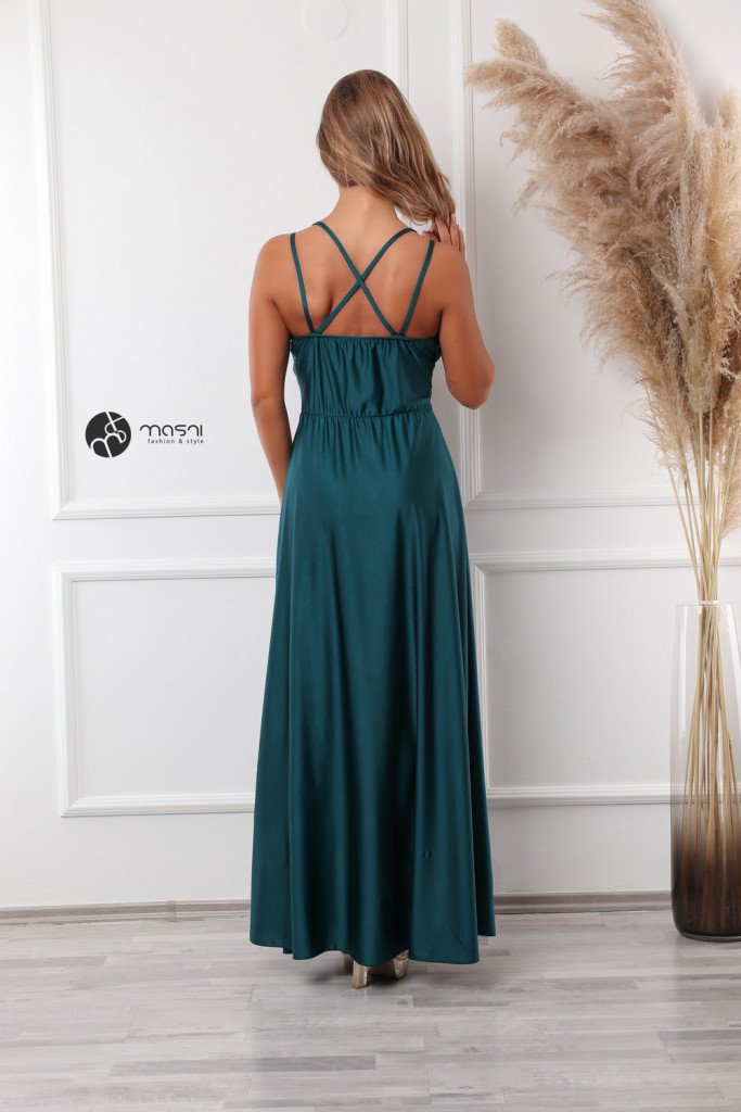 Ujjatlan, dekoltált, hátán X pántos, szoknya részen sliccelt, egyszínű, elasztikus szatén anyagú maxi ruha