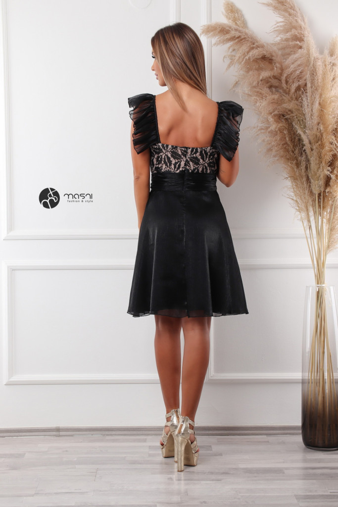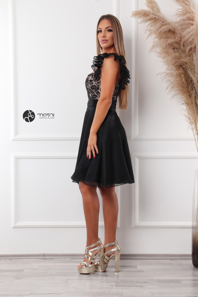 Ujjatlan, fodros vállú, csipke felsőrészes, derékban szabott ruha