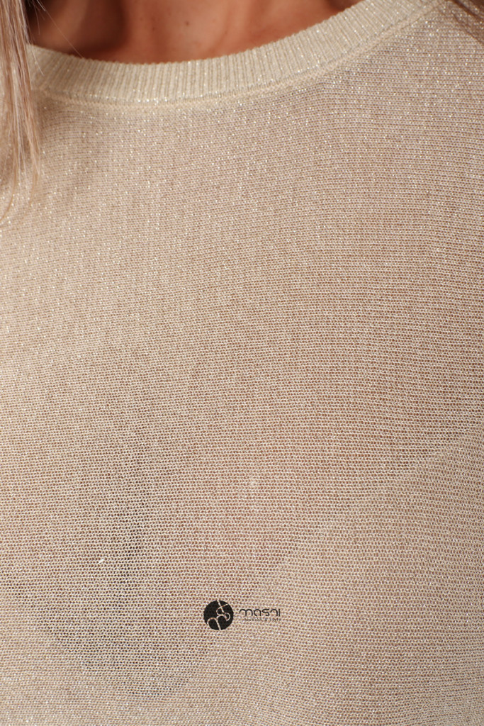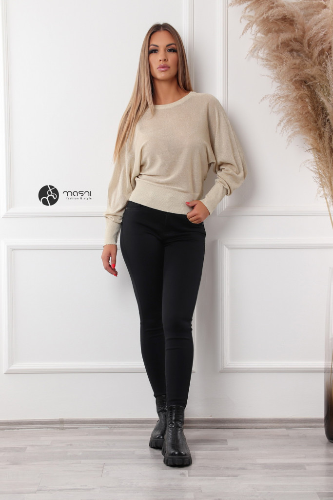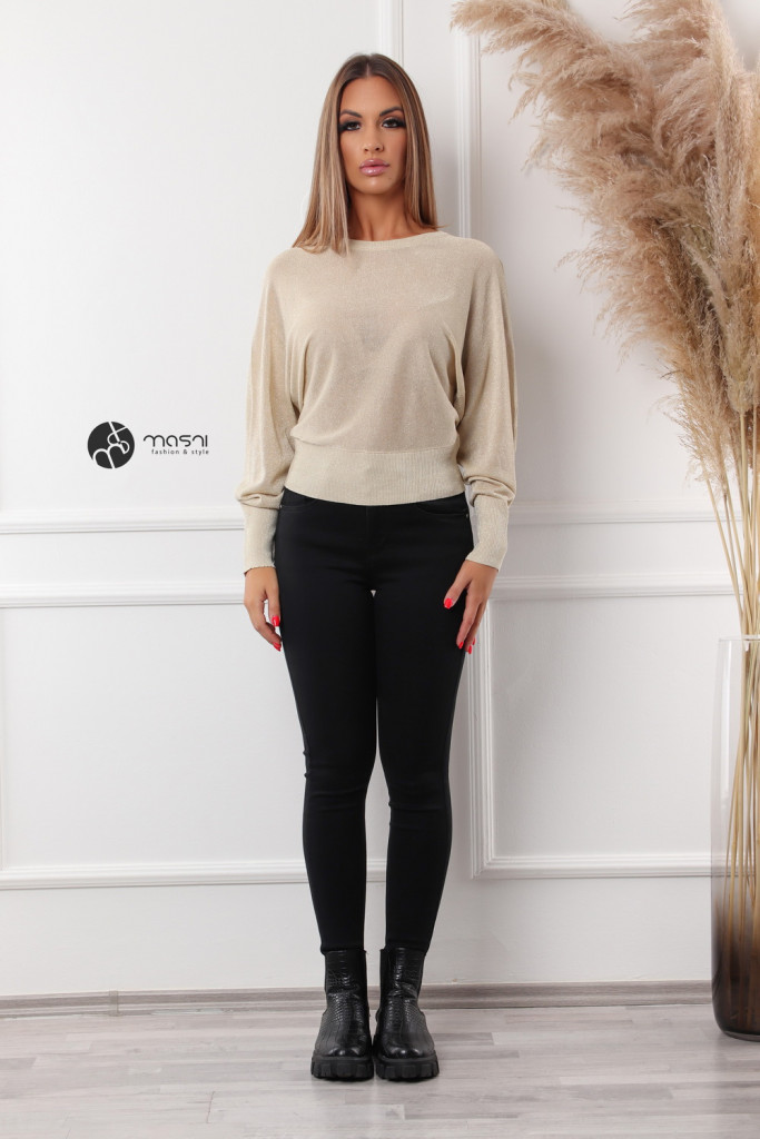 Kerek nyakú, lezser hosszú ujjú, derékban vastag passzés, anyagában csillogó felső