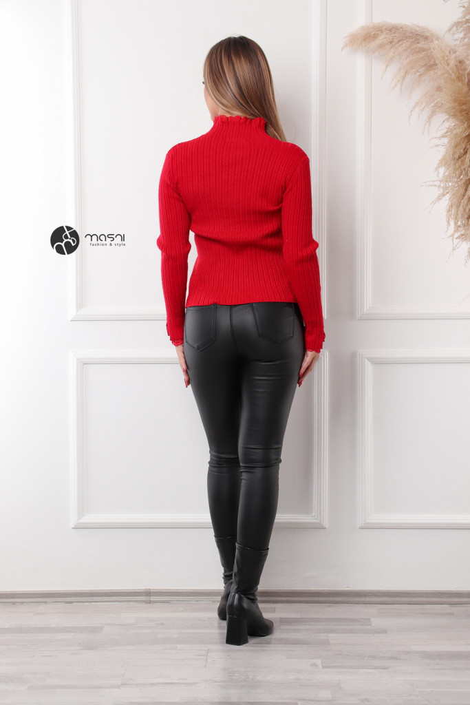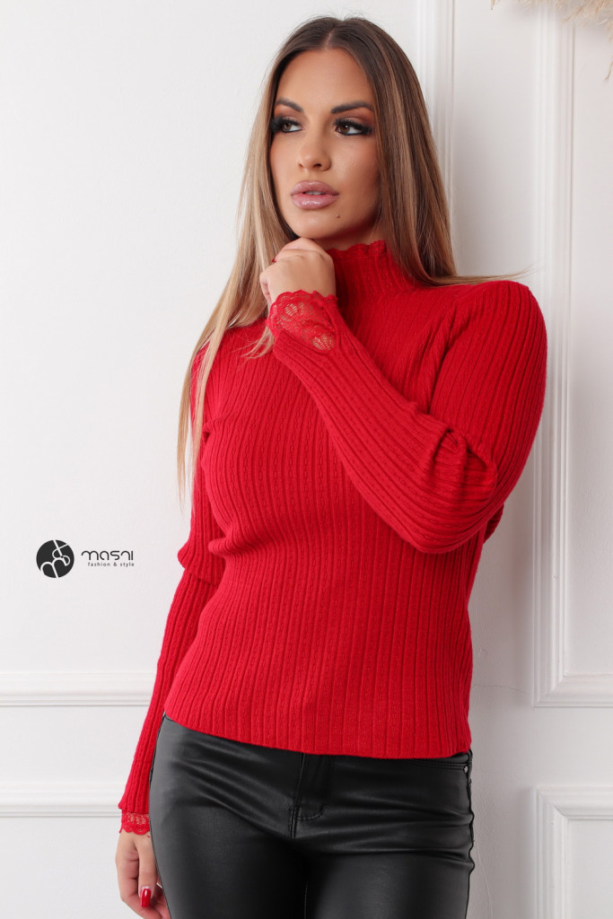 Hosszú ujjú, magas nyakú, nyakán és mandzsettáján csipke betétes, anyagában mintás kötött felső