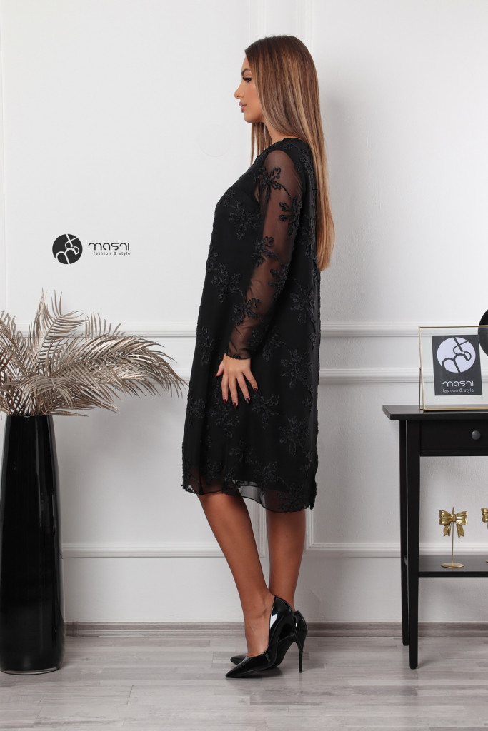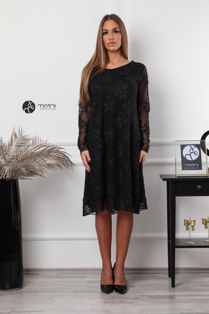 Kerek nyakú, hosszú ujjú, egyszínű csipkés necc ruha