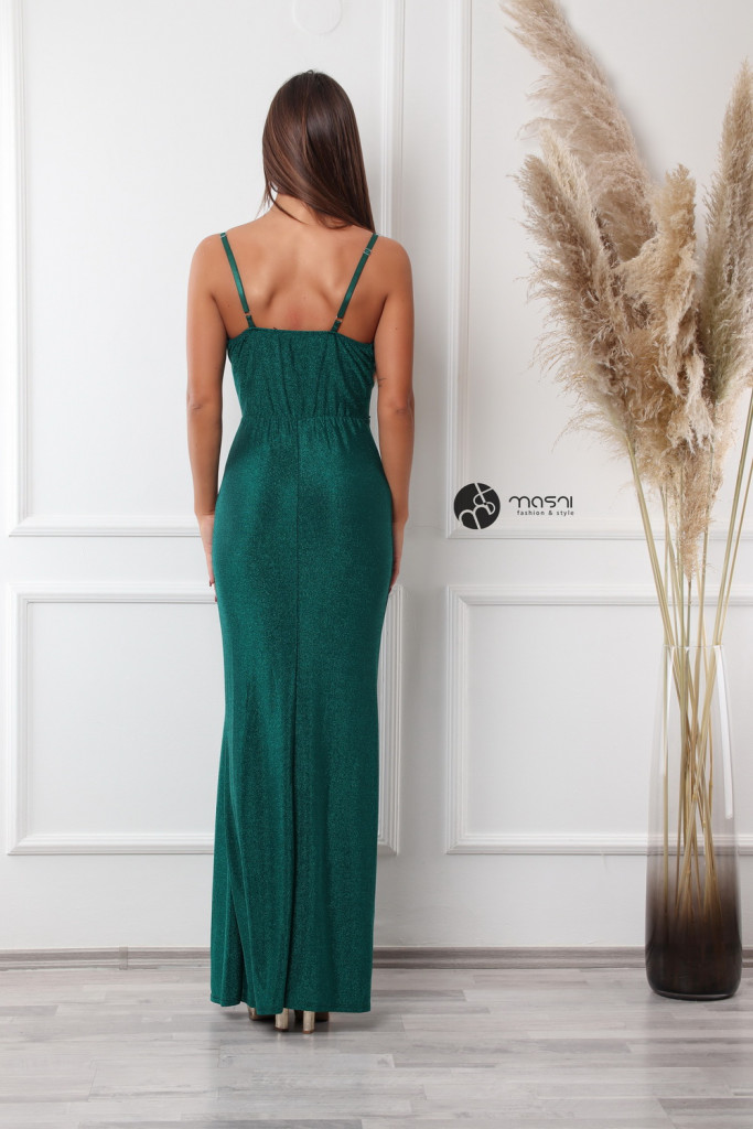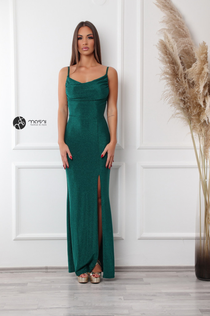 Ejtett nyakú, gumipántos, csillogó anyagú maxi ruha