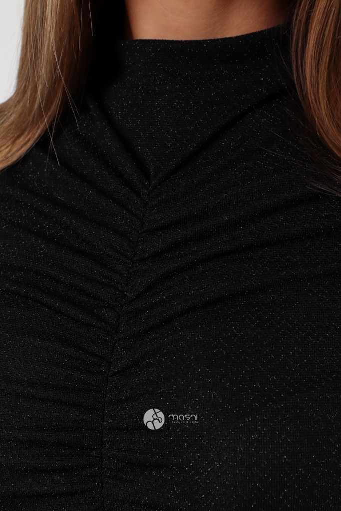 Hosszú ujjú, magas nyakú, elöl-hátul és oldalt húzott, anyagában csillogó ruha
