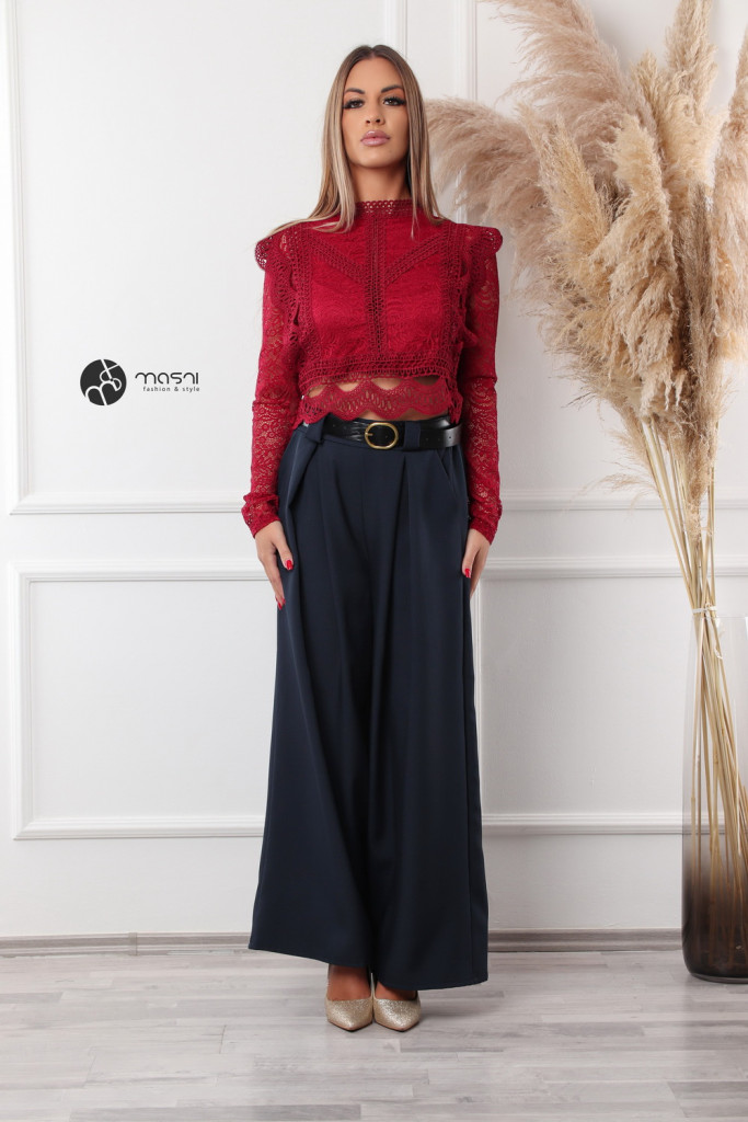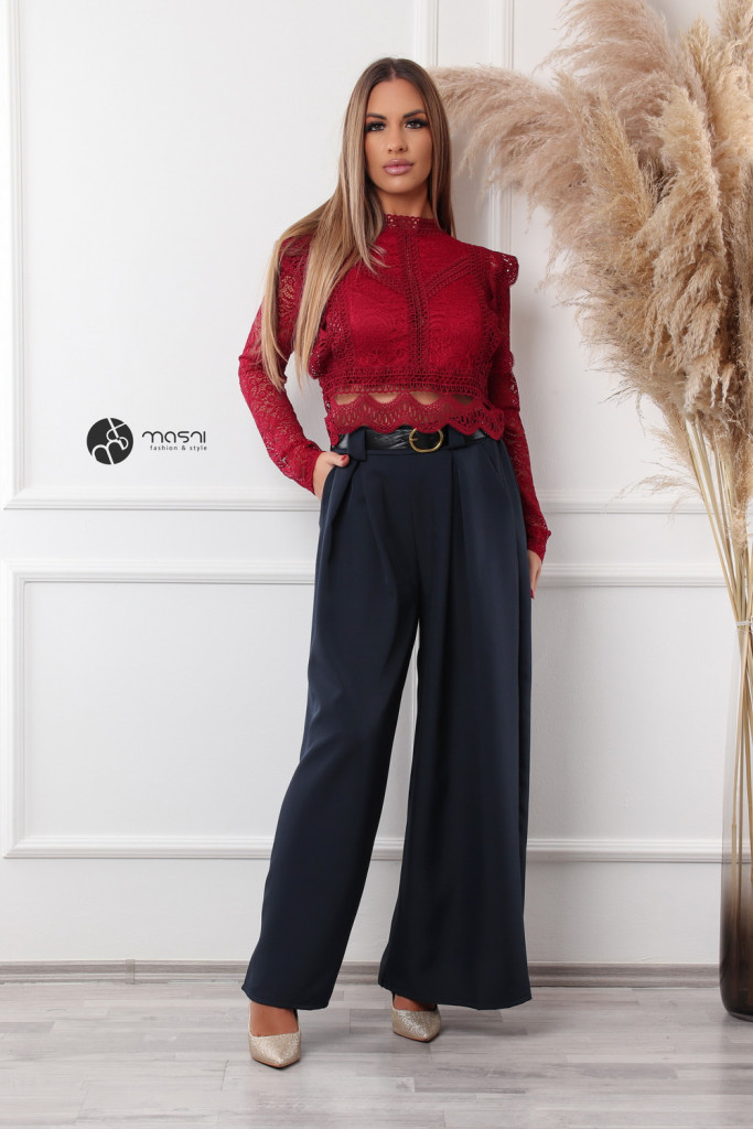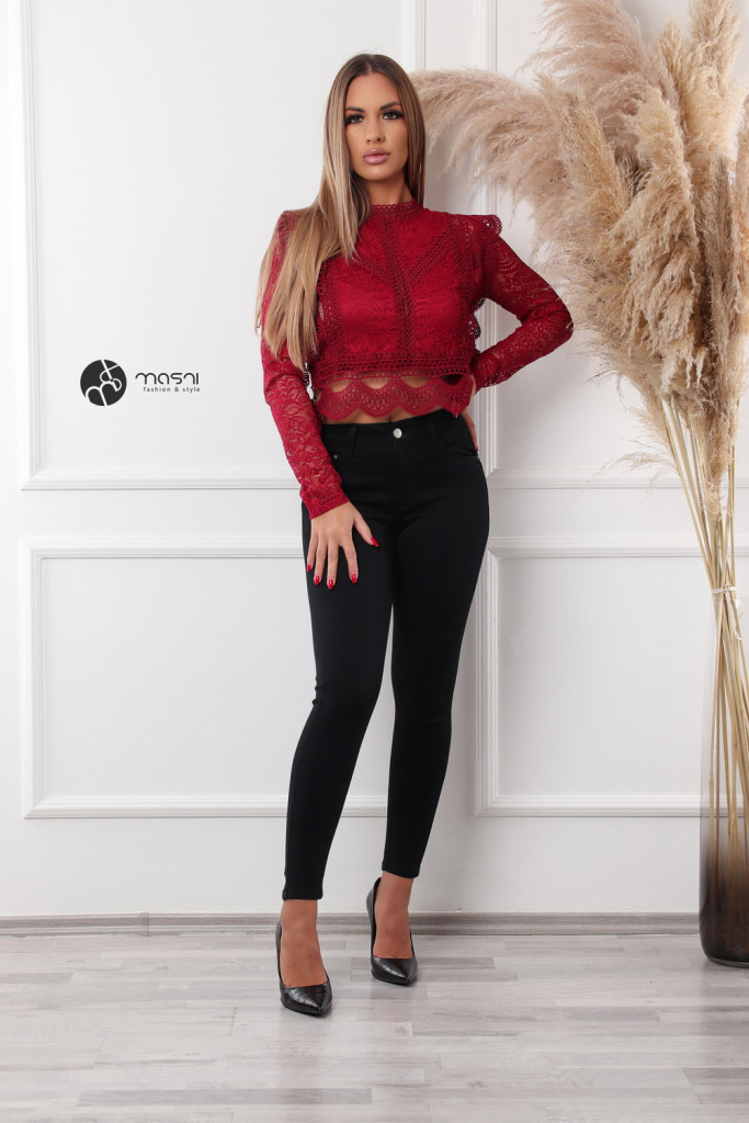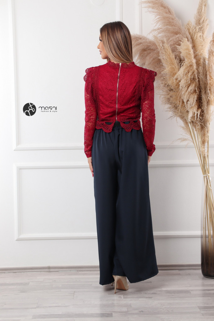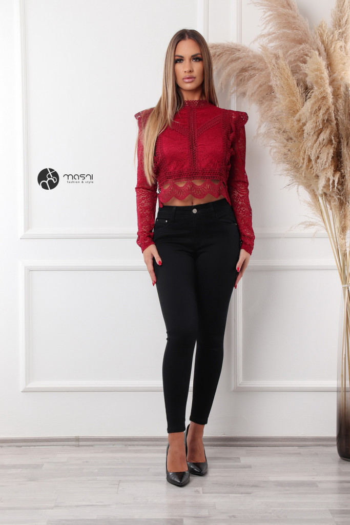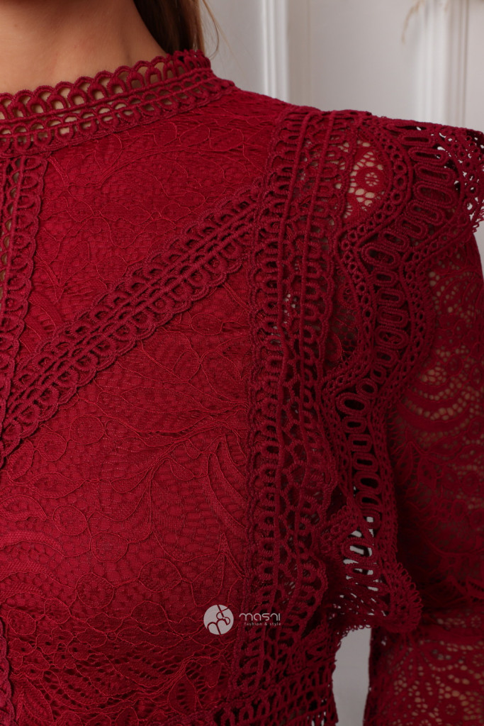 Magas nyakú, hosszú ujjú, hátán cipzáros, fodros csipke felső