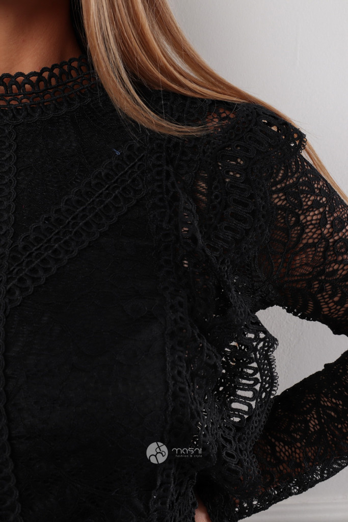 Fodros hosszú ujjú csipke felső fekete