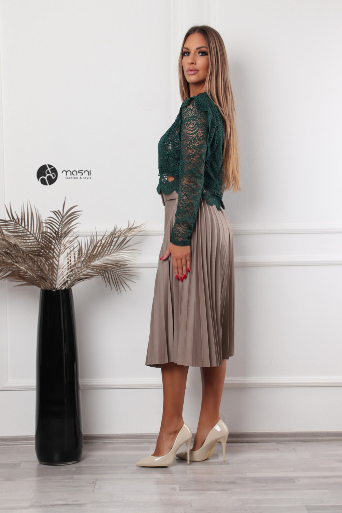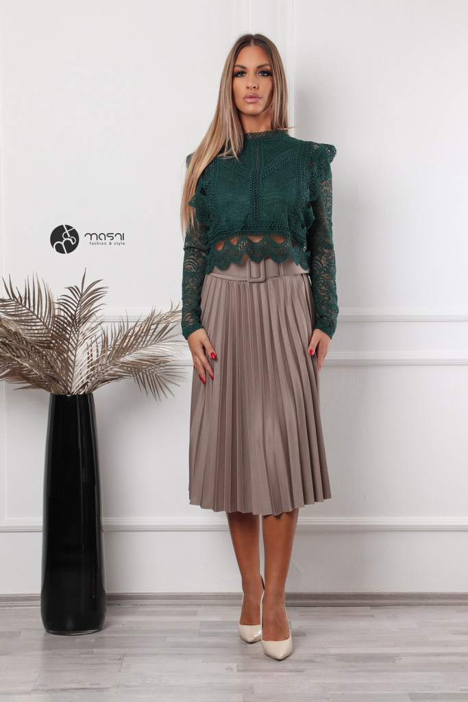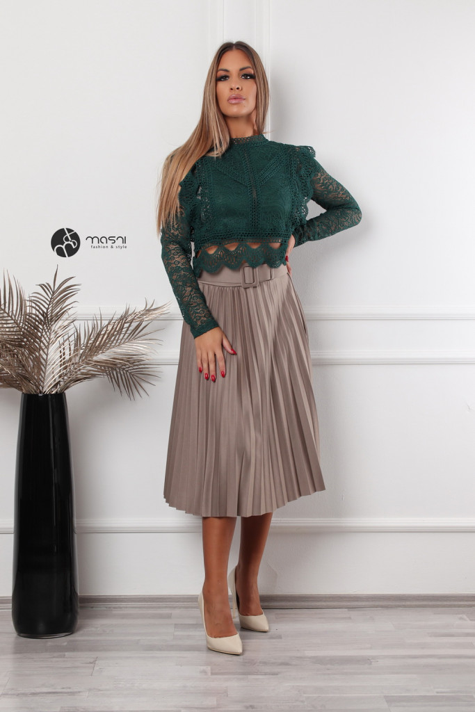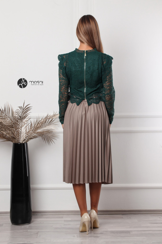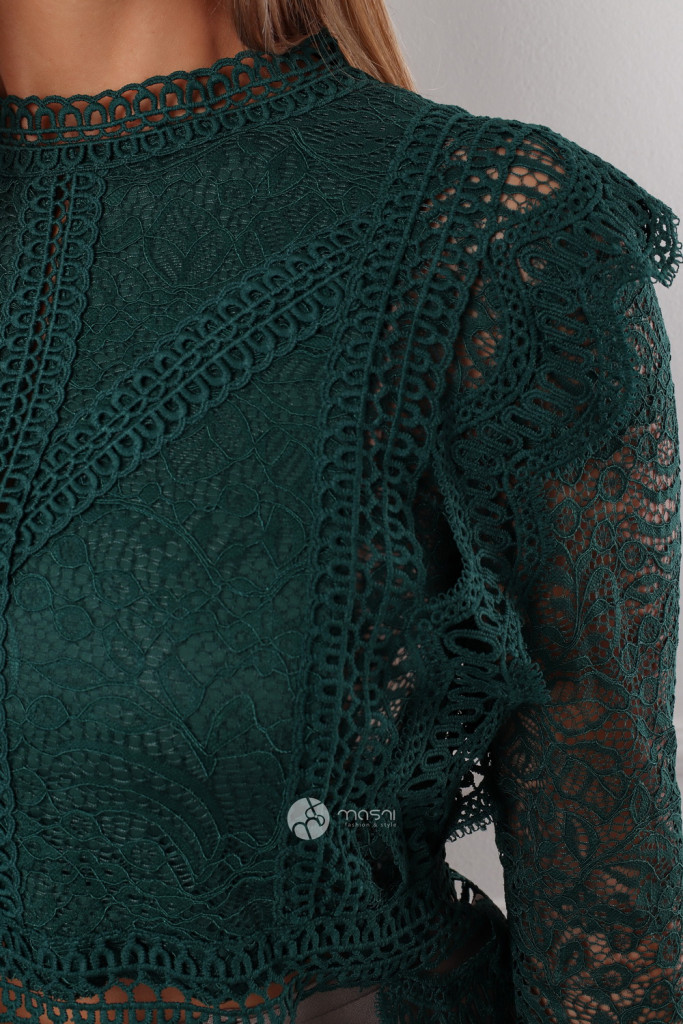 Magas nyakú, hosszú ujjú, hátán cipzáros, fodros csipke felső