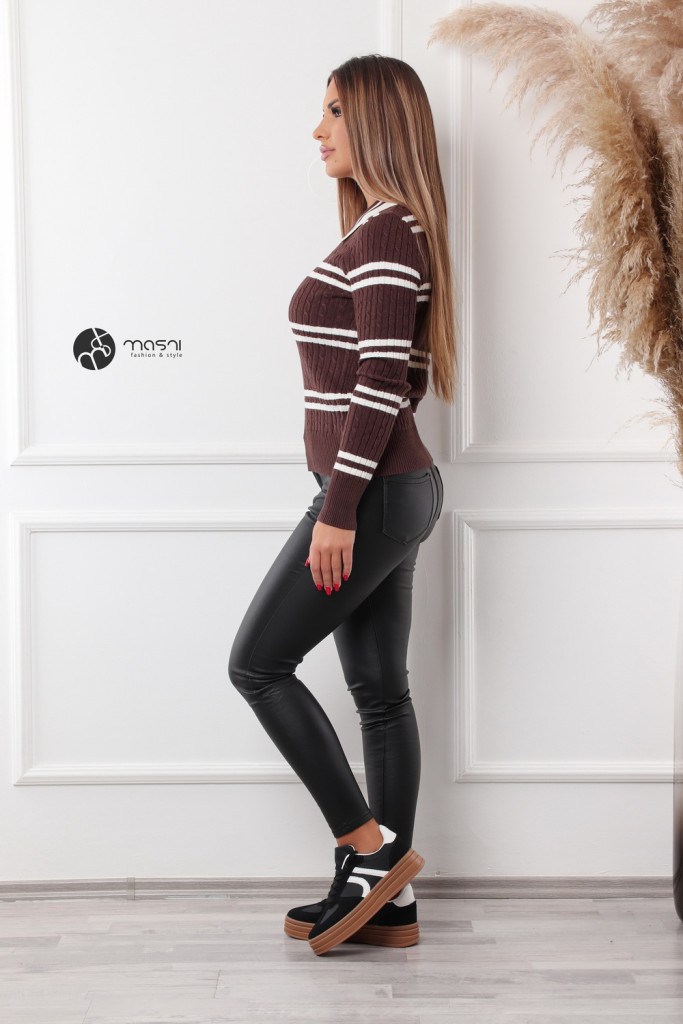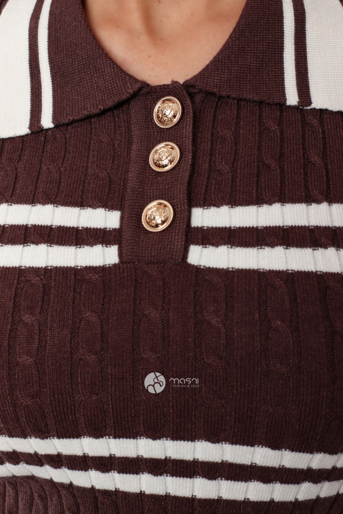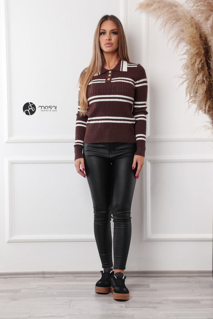 Hosszú ujjú, galléros, nyakán arany gombos, csíkos kötött felső