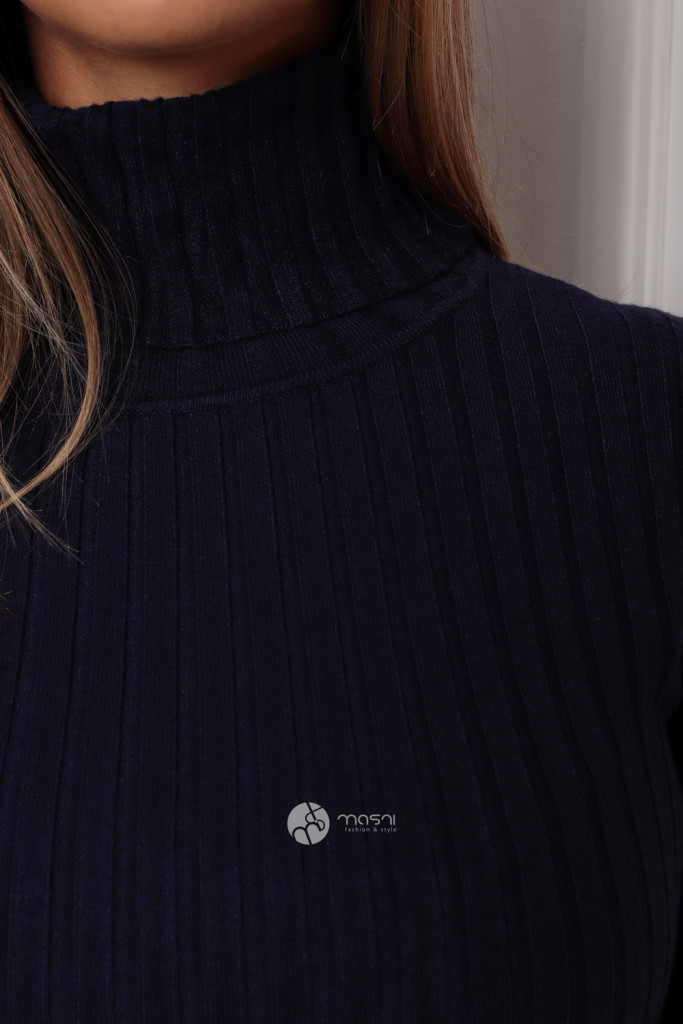 Garbós nyakú, bordás anyagú kötött ruha sötétkék
