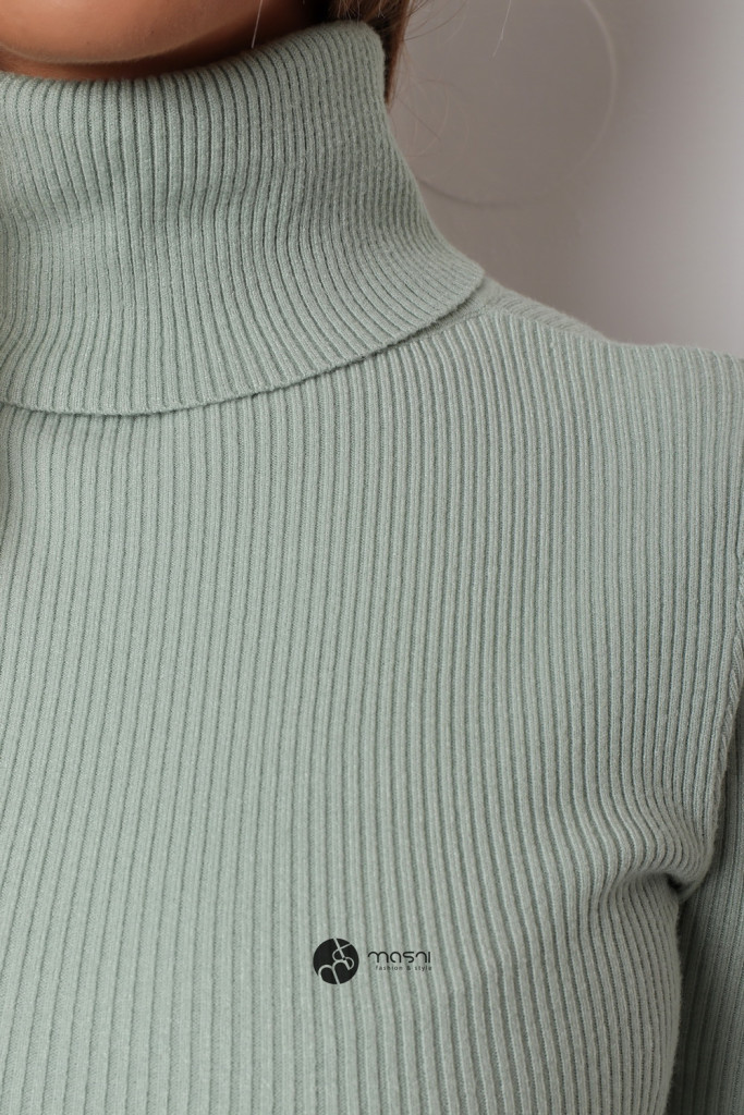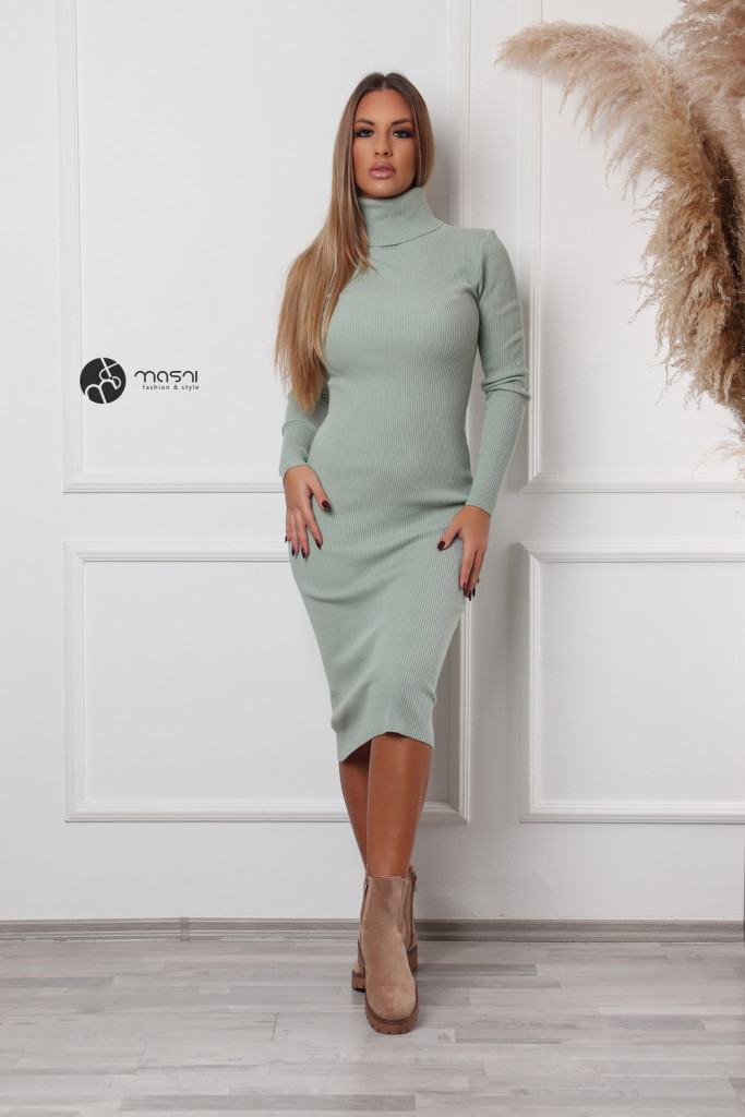 Hosszú ujjú, garbós nyakú, bordás anyagú, egyszínű, térd alá érő egyszínű kötött ruha