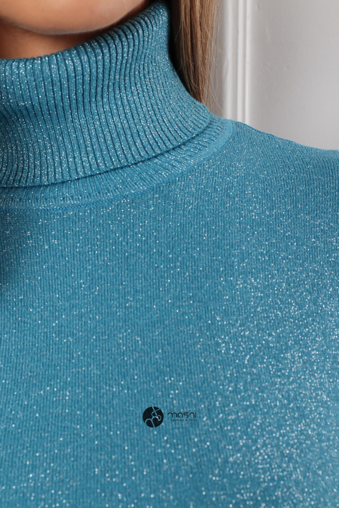 Hosszú ujjú, garbós nyakú, csillogó anyagú kötött pulcsi