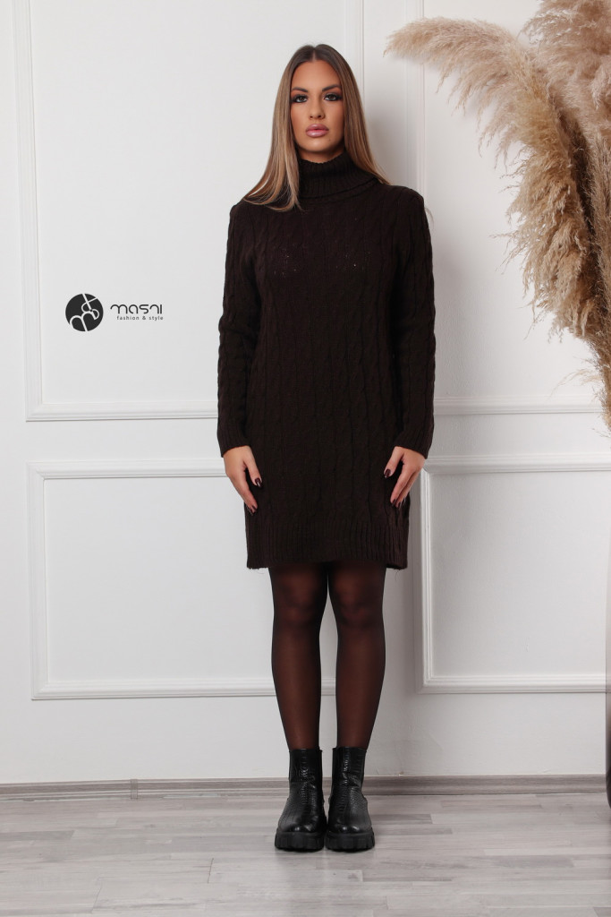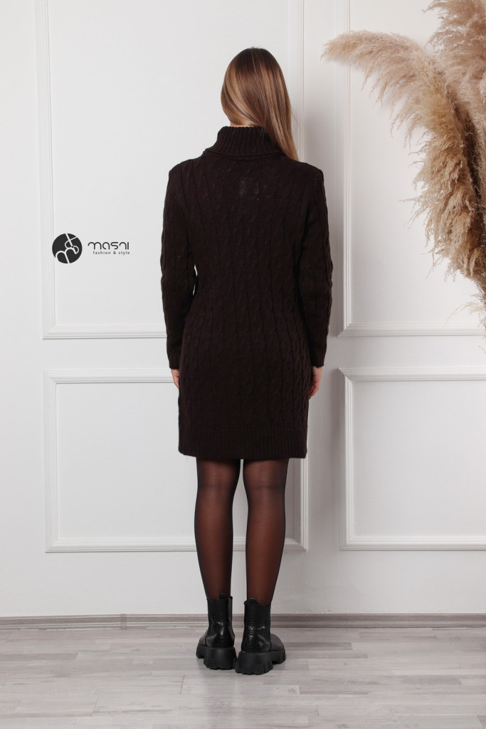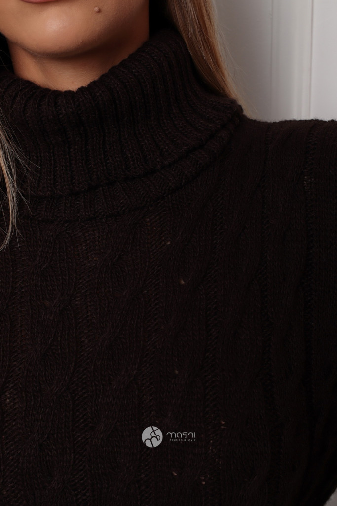 Garbós nyakú fonott mintás kötött tunika/ruha sötétbarna