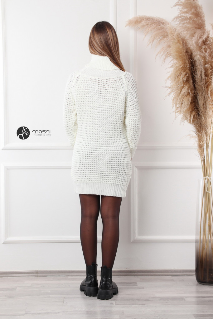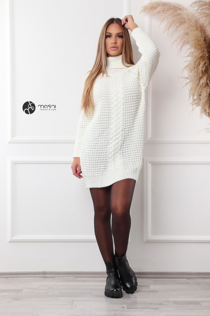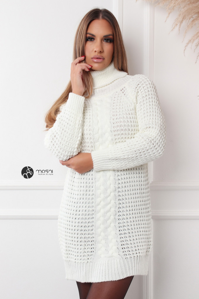 Garbós nyakú középen fonott mintás kötött ruha fehér