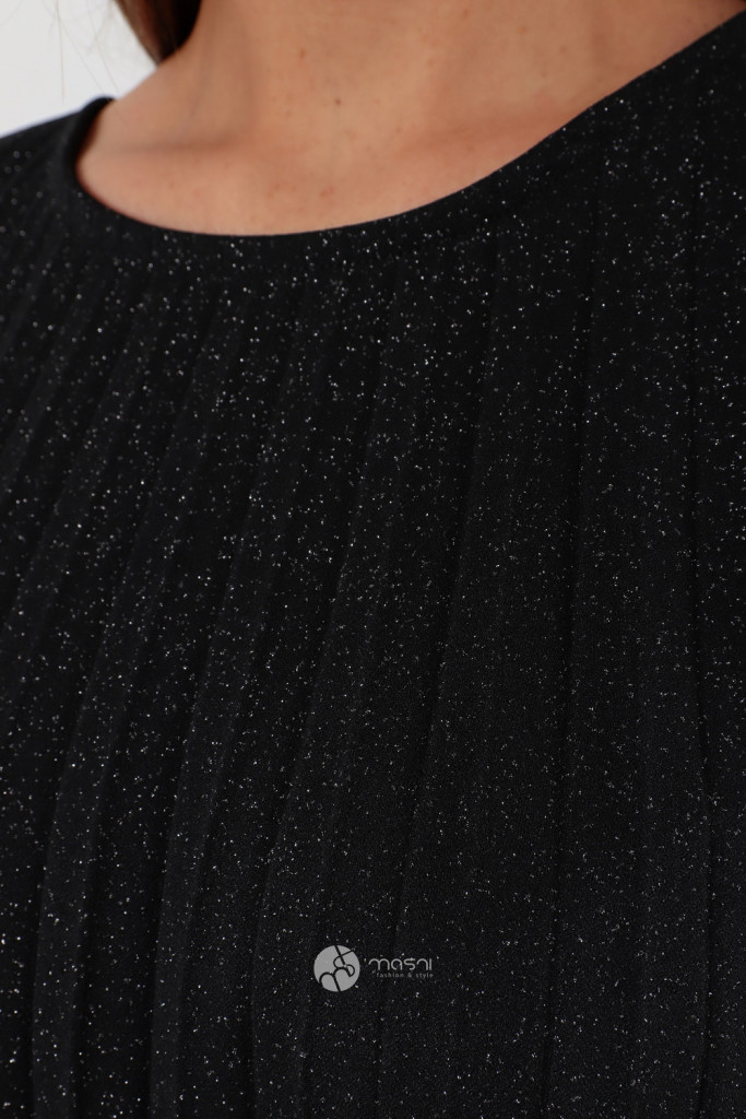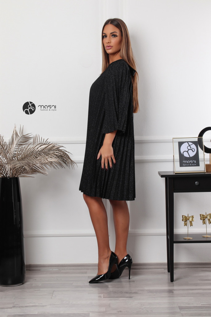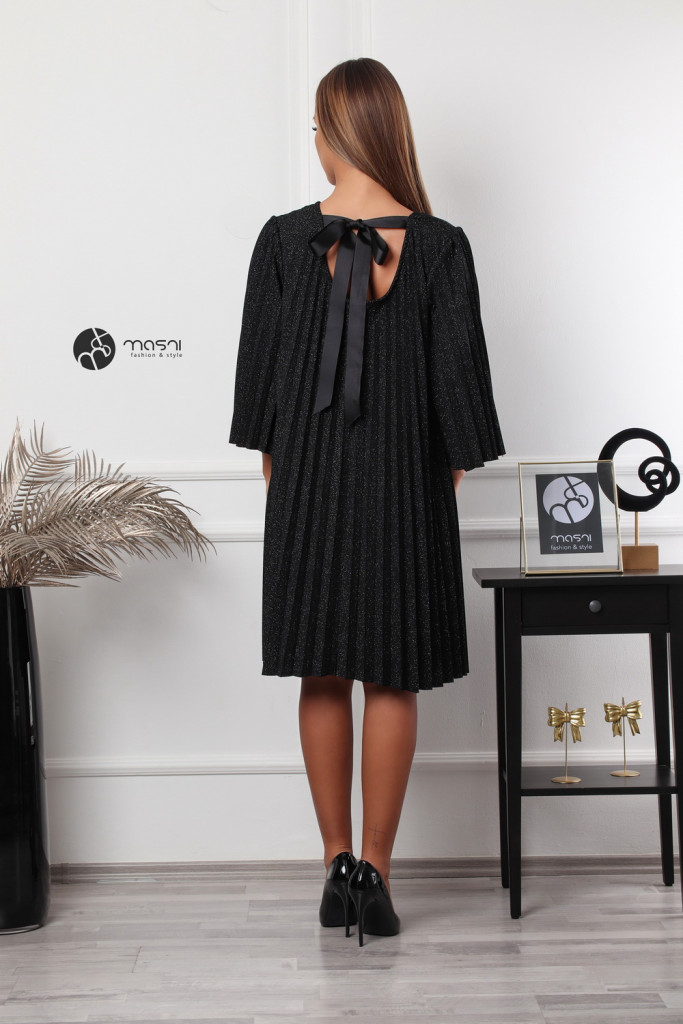 Kerek nyakú, hátán masnis, anyagában csillogó, pliszírozott oversize ruha