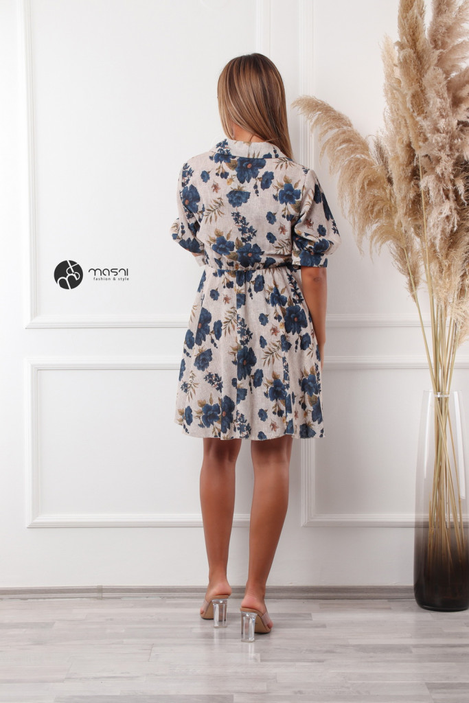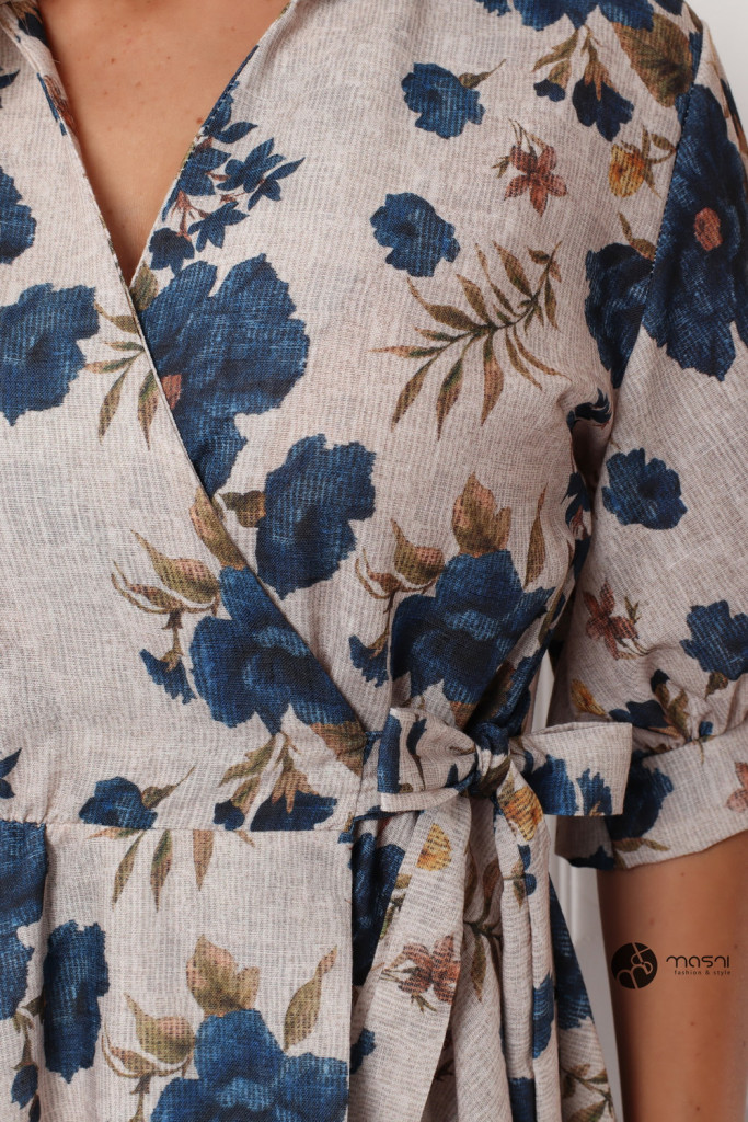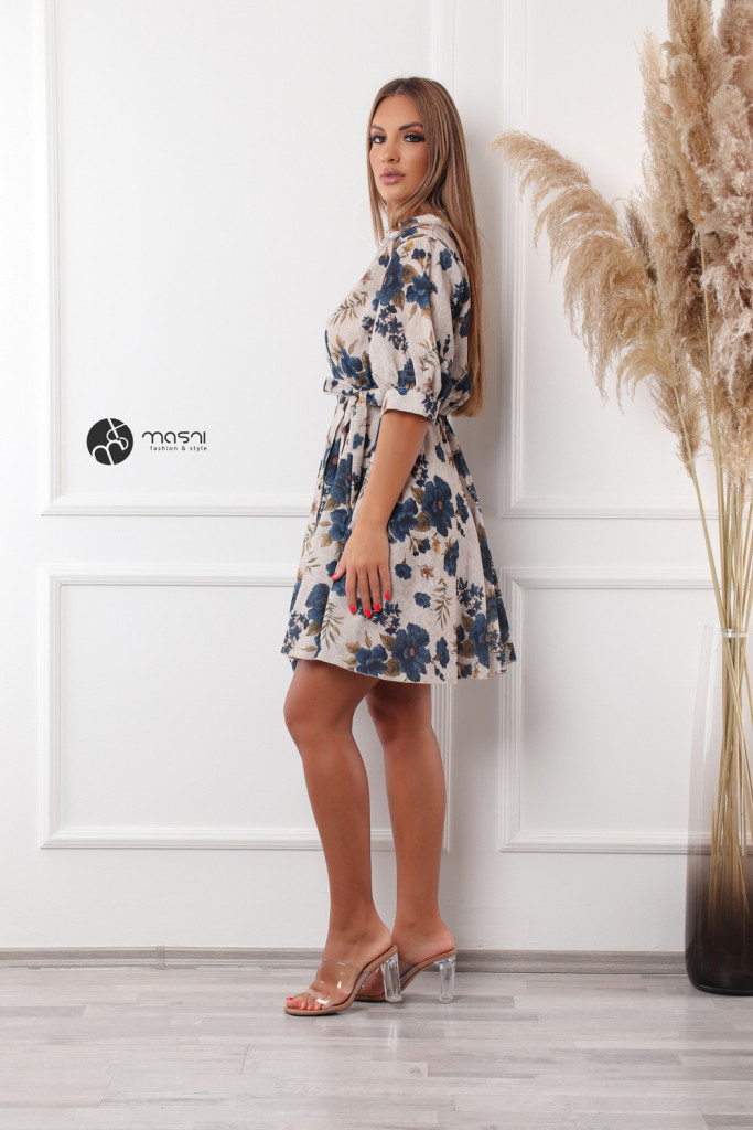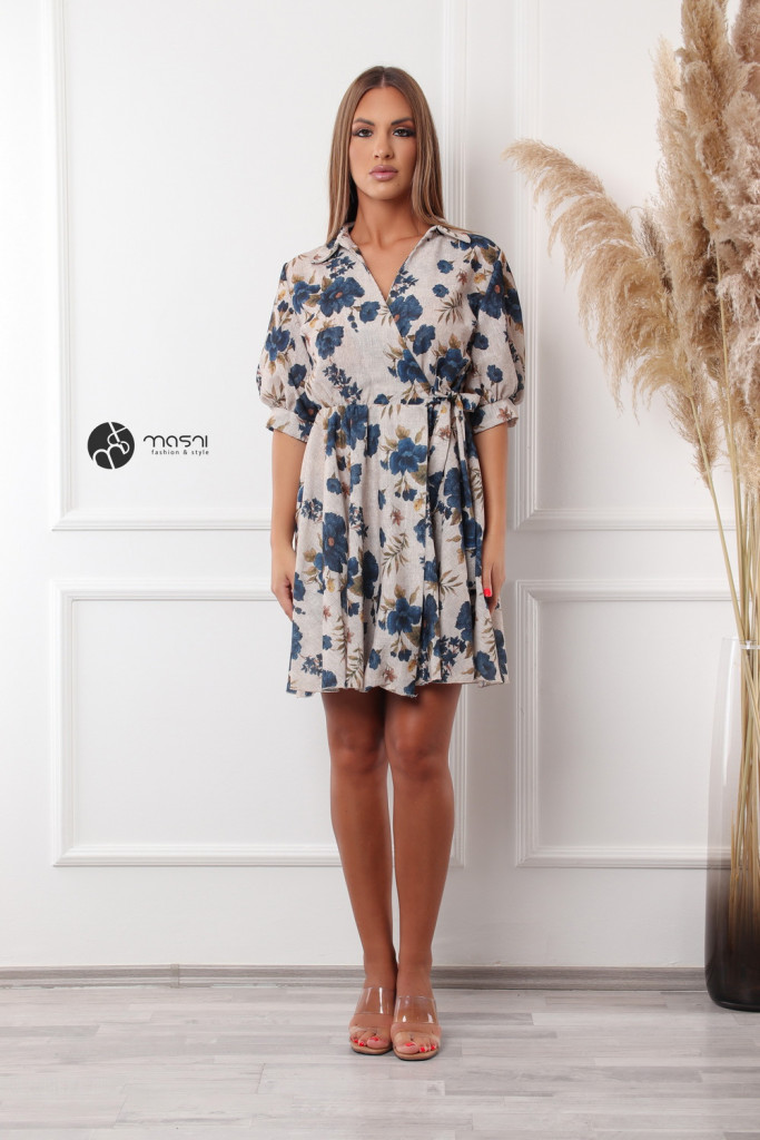 Galléros, rövid ujjú, átlapolt, derékban megkötős virágmintás ruha