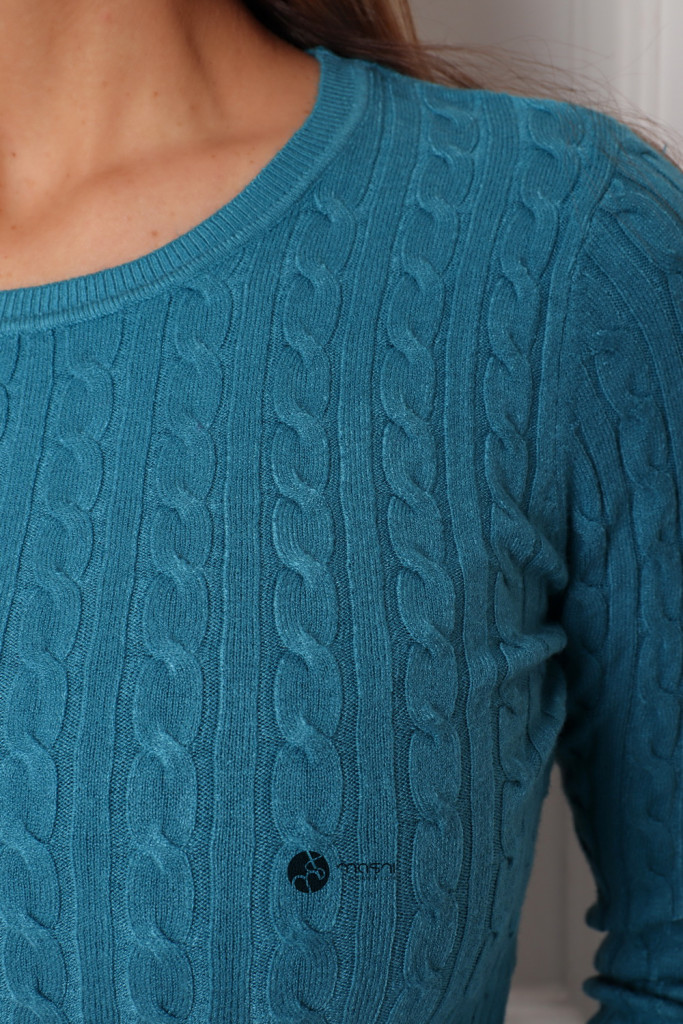 Hosszú ujjú, kerek nyakú, fonott mintás egyszínű kötött pulcsi