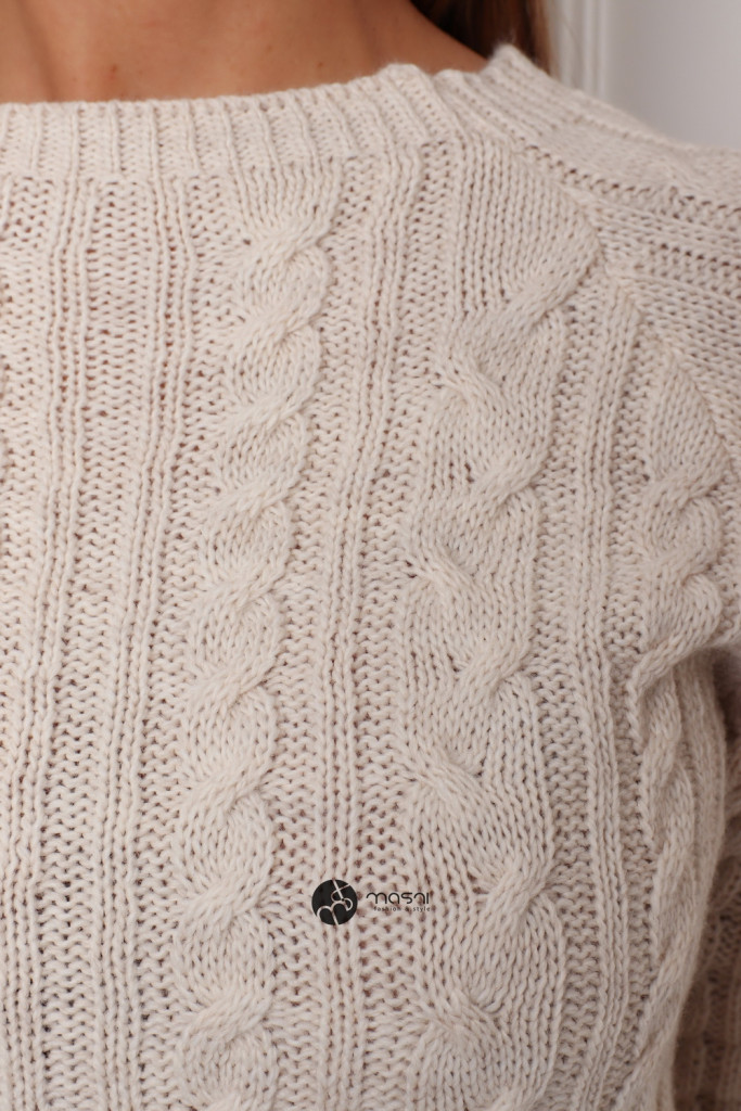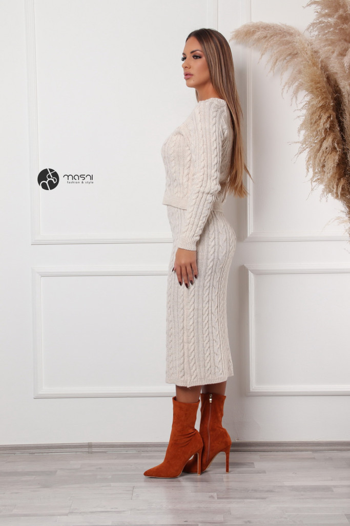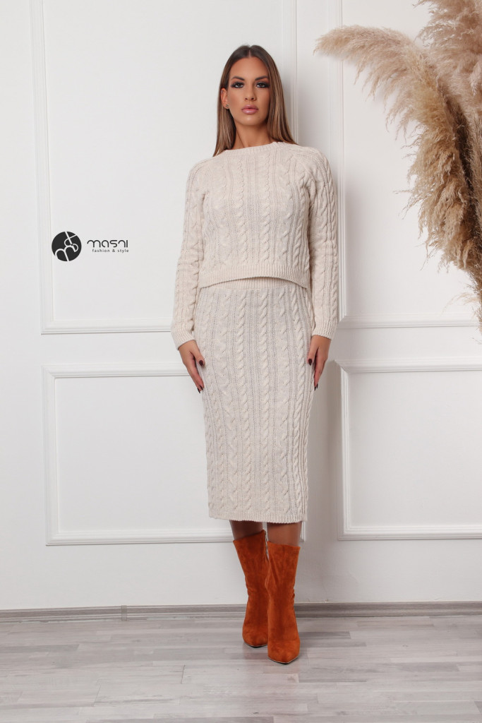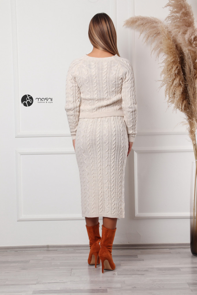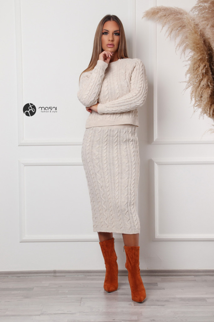 Egyszínű, fonott mintás kötött szett. Hosszú ujjú, kerek nyakú pulcsi + ceruza szoknya.