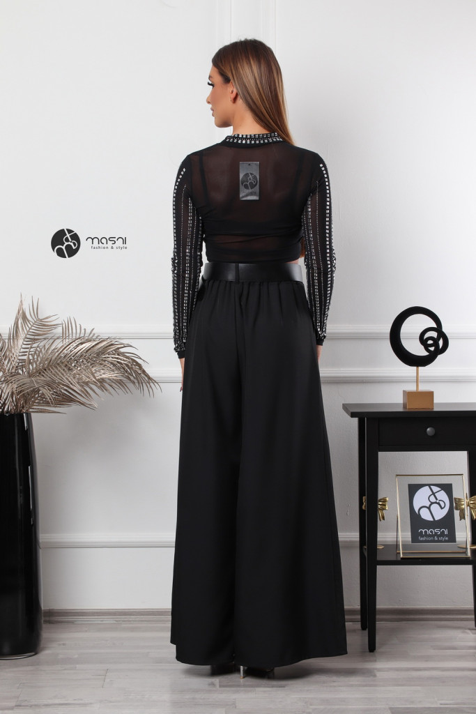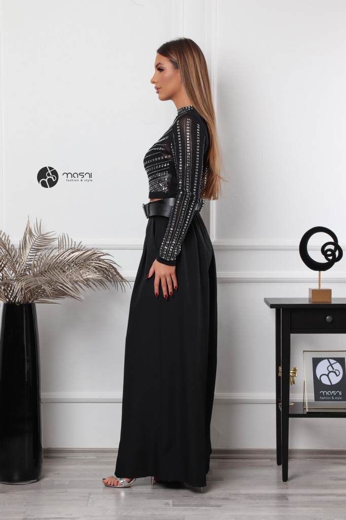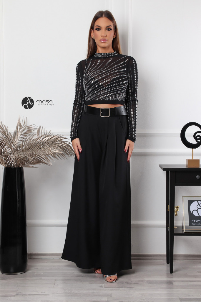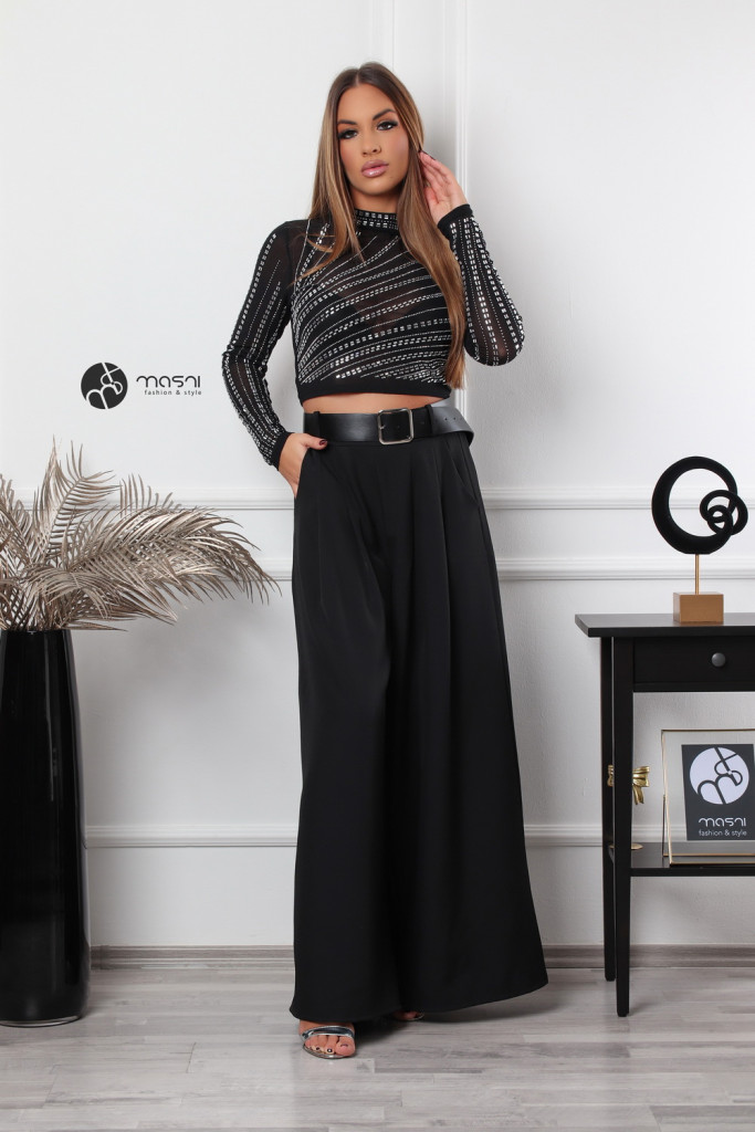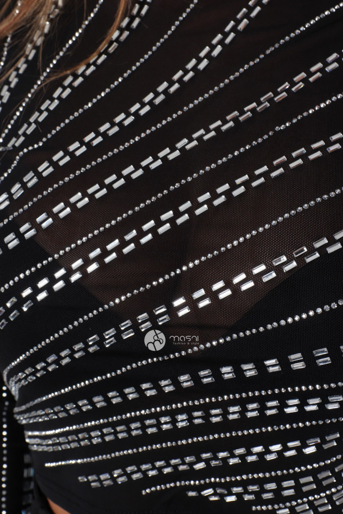 Hosszú ujjú, zárt nyakú, rövid derekú, kövezett fekete necc felső