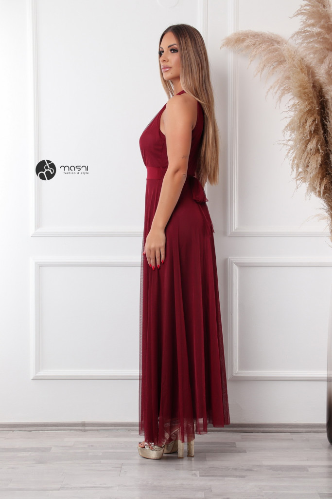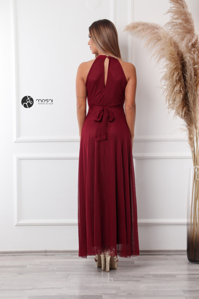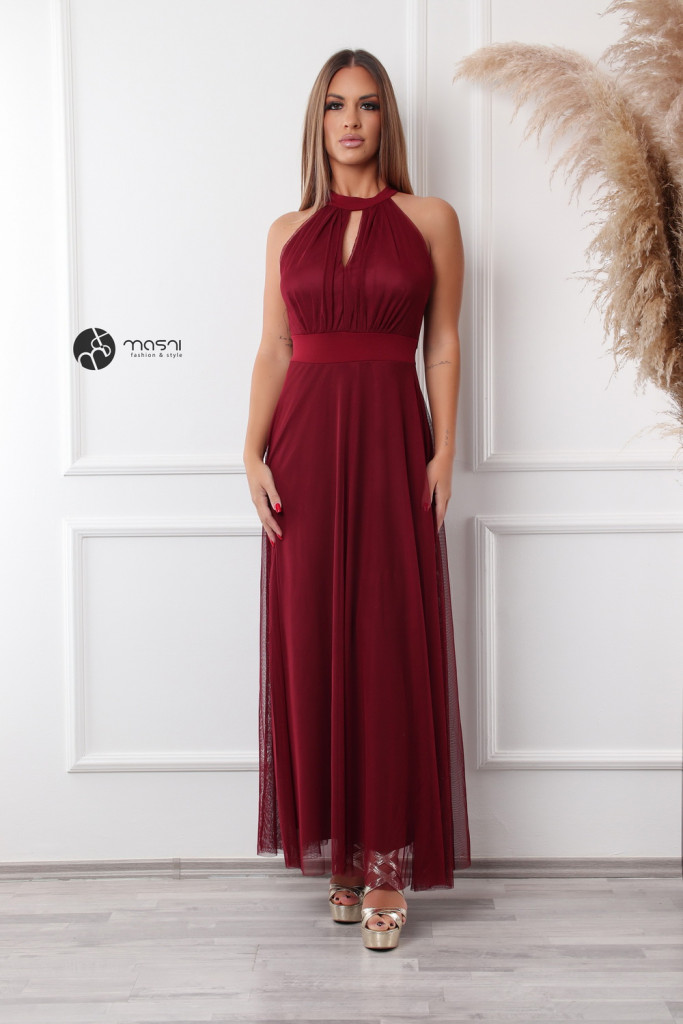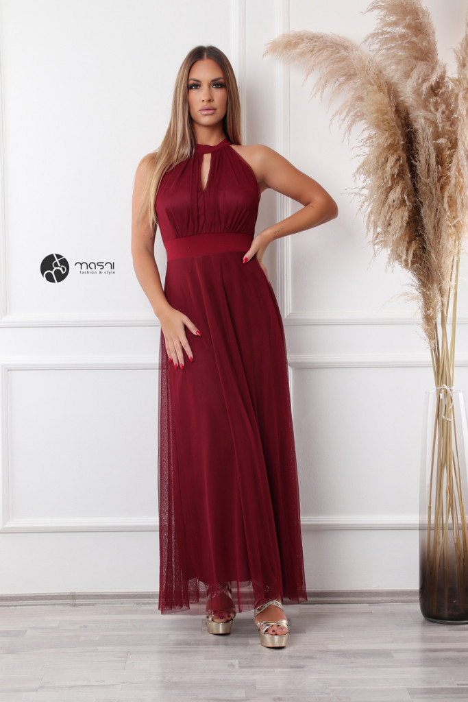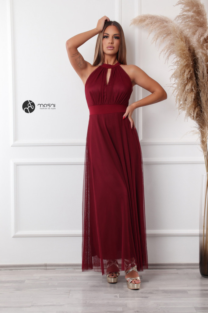 Ujjatlan, magas nyakú, mellnél kivágott, mell alatt szabott egyszínű tüll maxiruha pamut alsóval, hátul kötővel