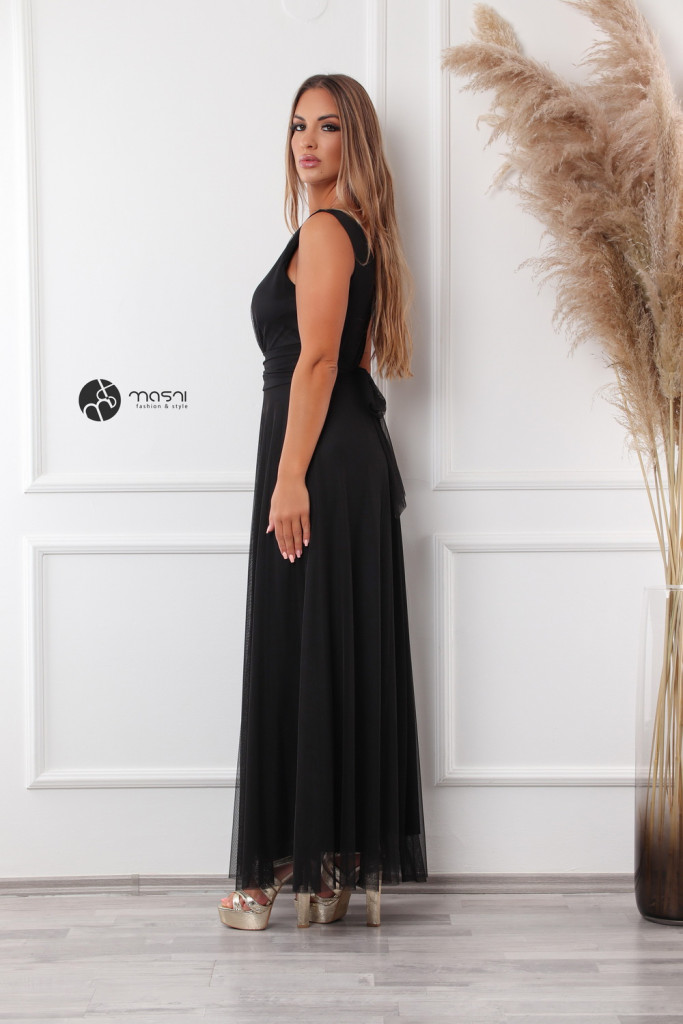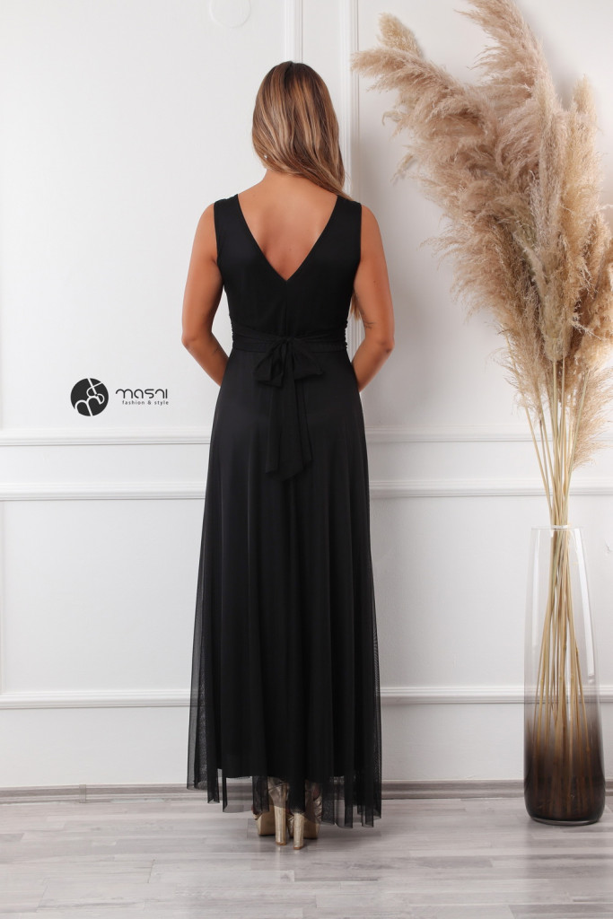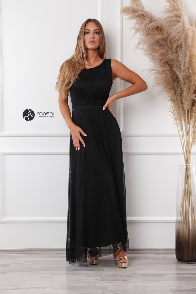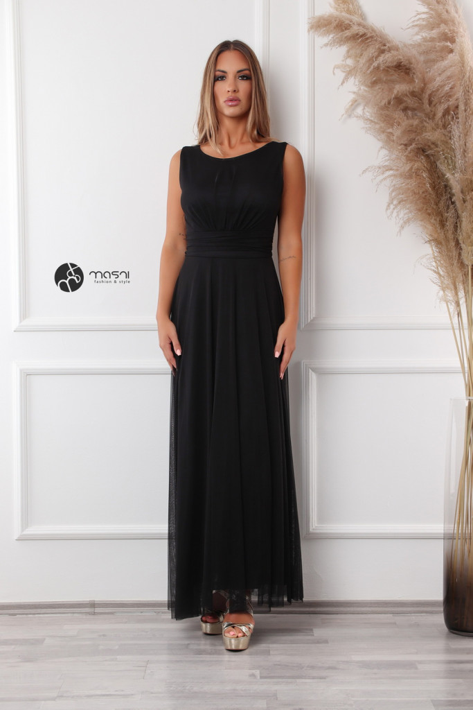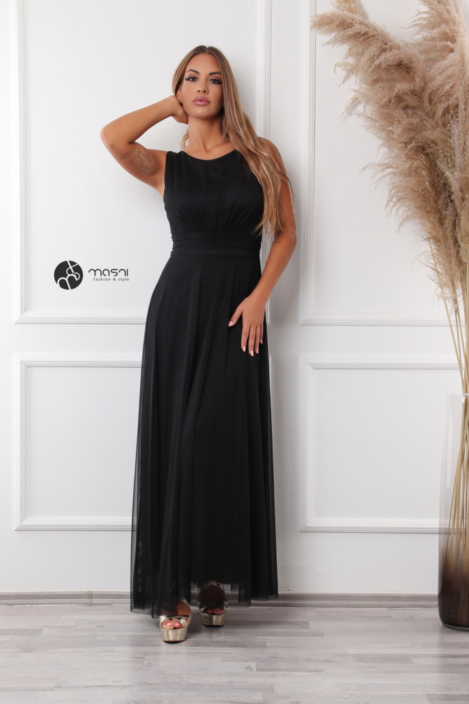 Ujjatlan, zárt kerek nyakú, mell alatt szabott egyszínű tüll maxiruha pamut alsóval, hátul kötővel