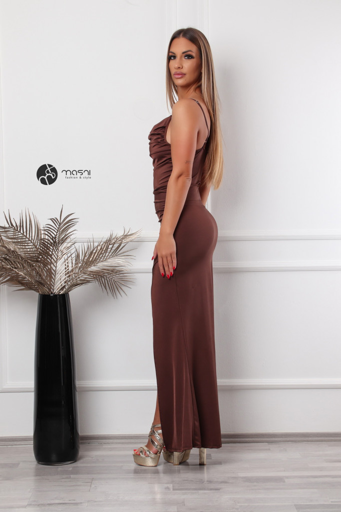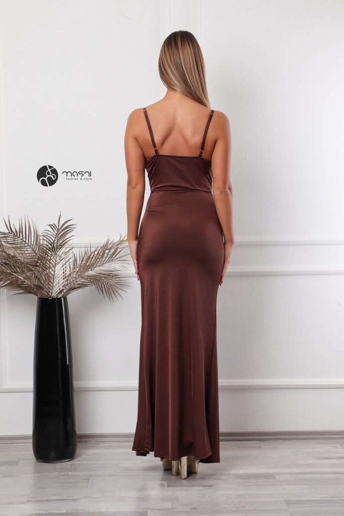 Ujjatlan, ejtett nyakú, gumipántos, szoknya részen átlapolt, elasztikus anyagú, alakkövető szatén hatású ruha