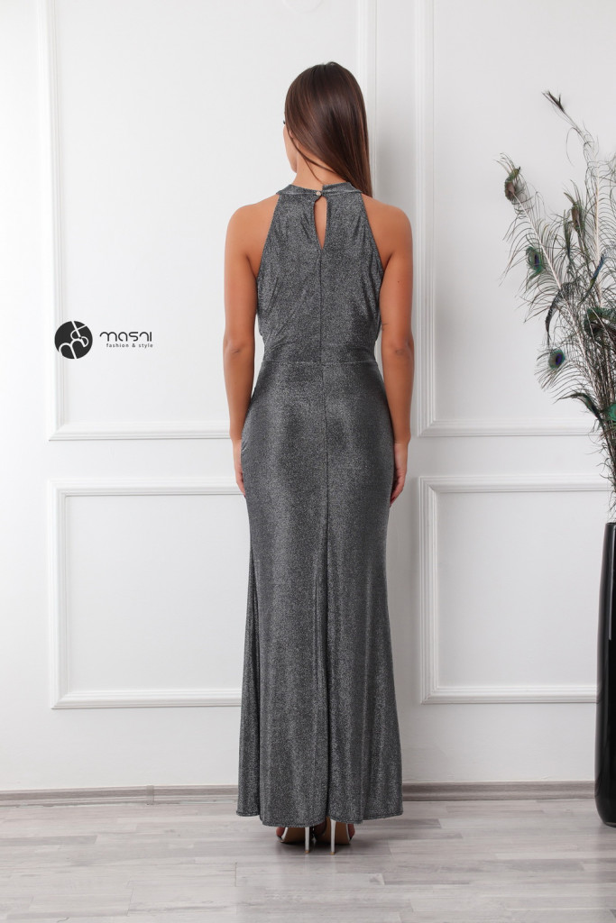 Magas nyakú, oldalt húzott, szoknya részen sliccelt, csillogó anyagú maxi ruha