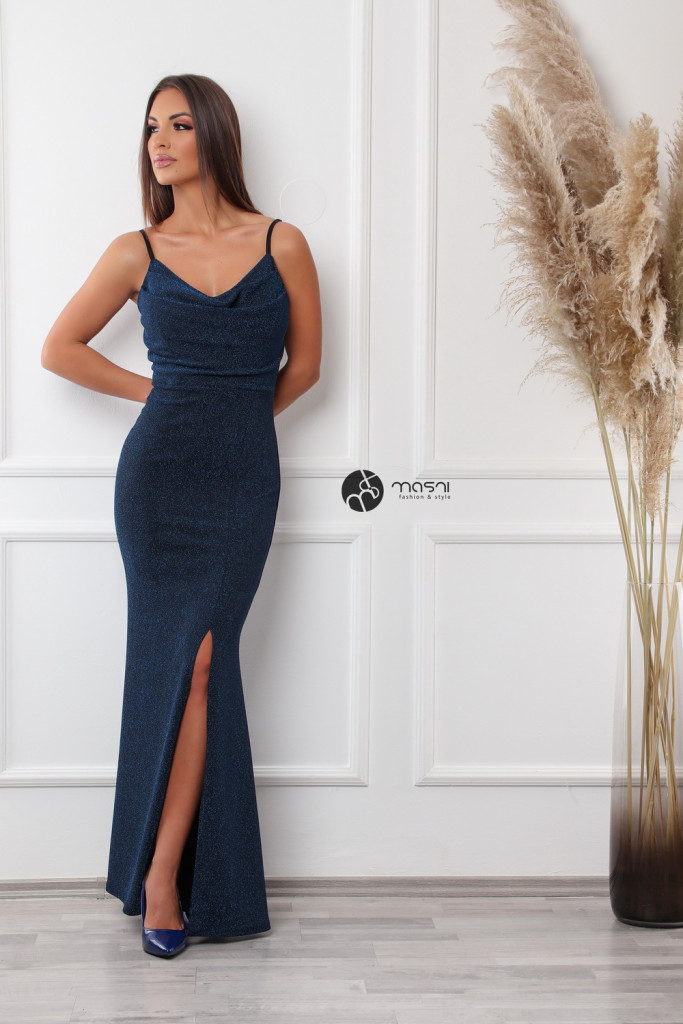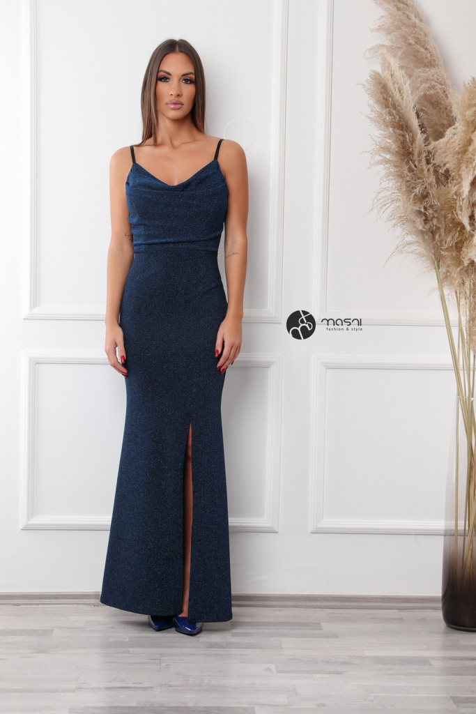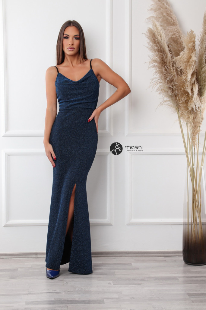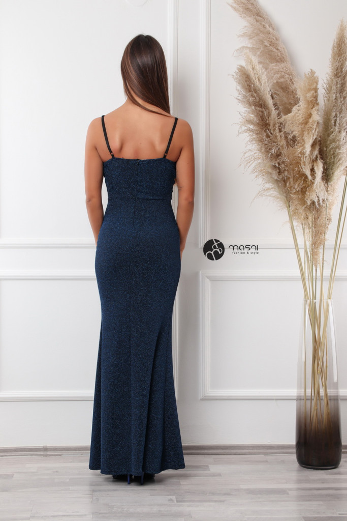 Gumipántos, mellnél ráncolt, szoknya részen sliccelt, anyagában csillogó maxi ruha