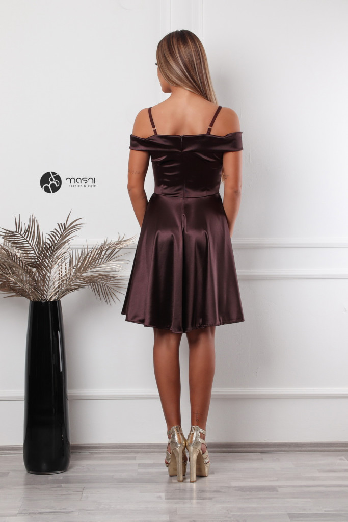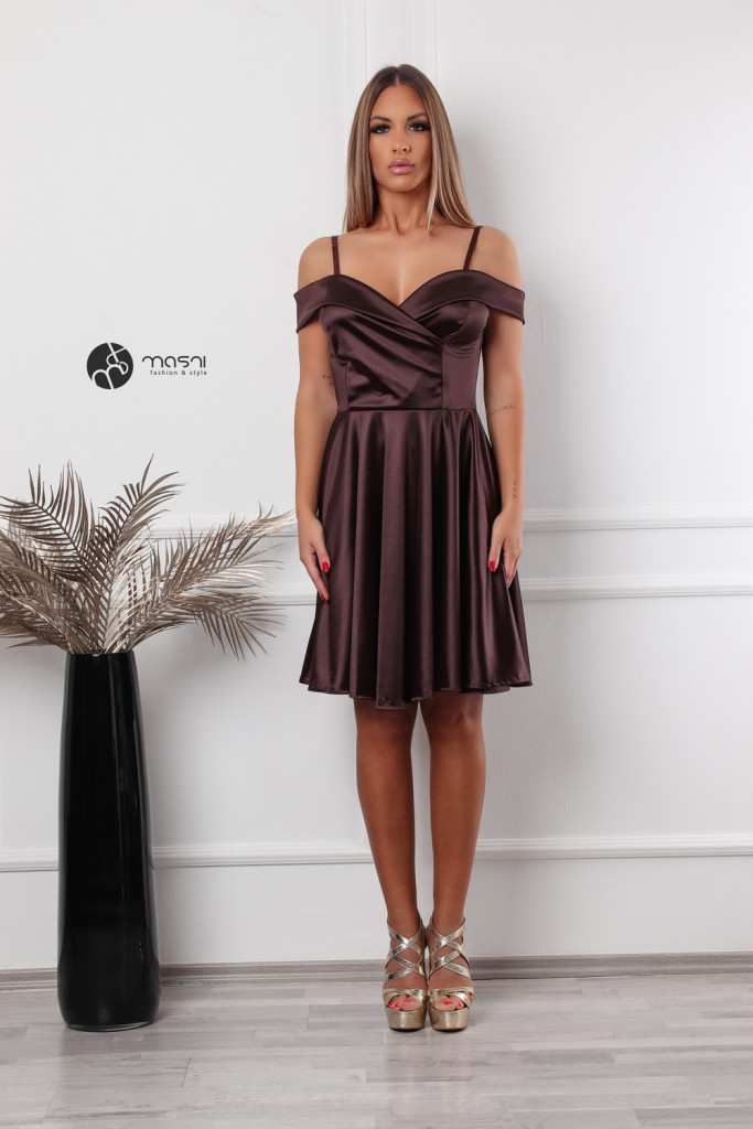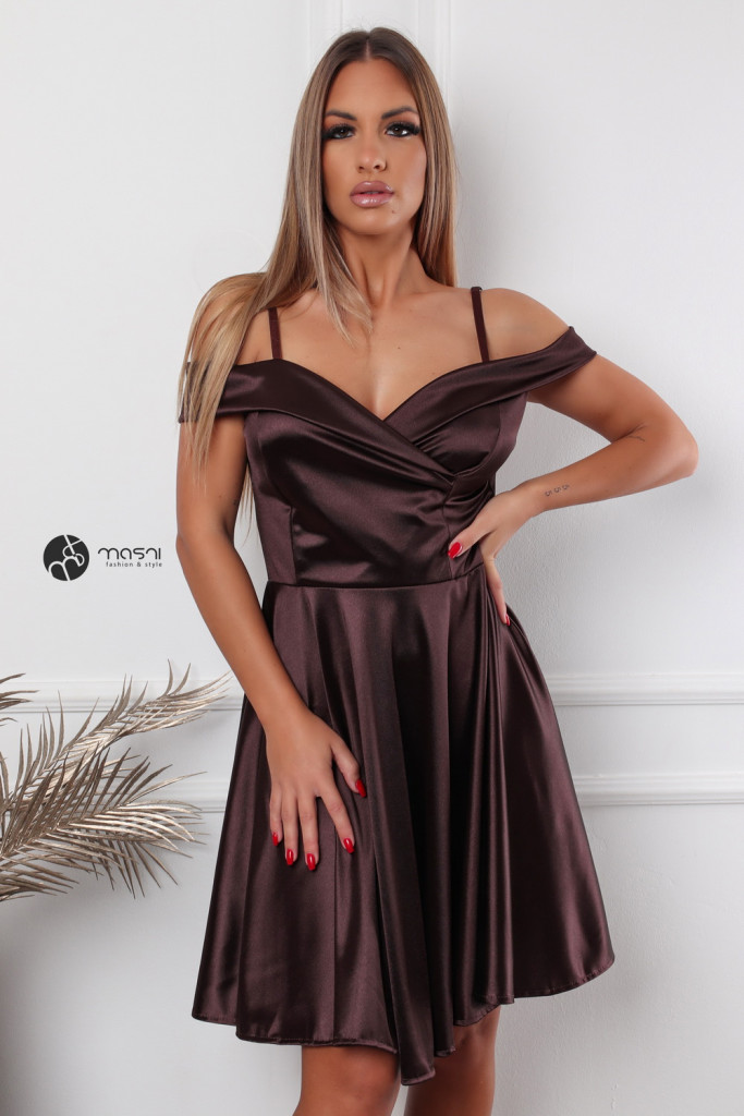 Ejtett vállú, dekoltált, derékban szabott egyszínű szatén ruha