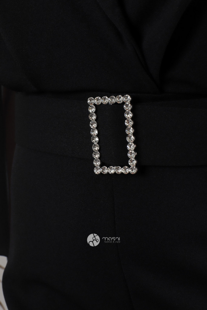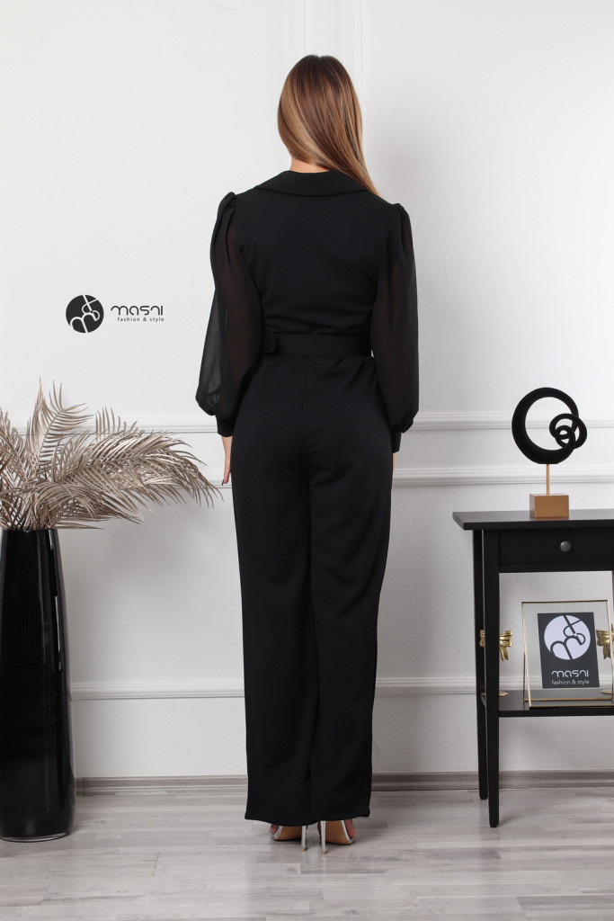 Hosszú necc ujjú, nagy galléros, dekoltált, bőszárú nadrágos, egyszínű overál övvel