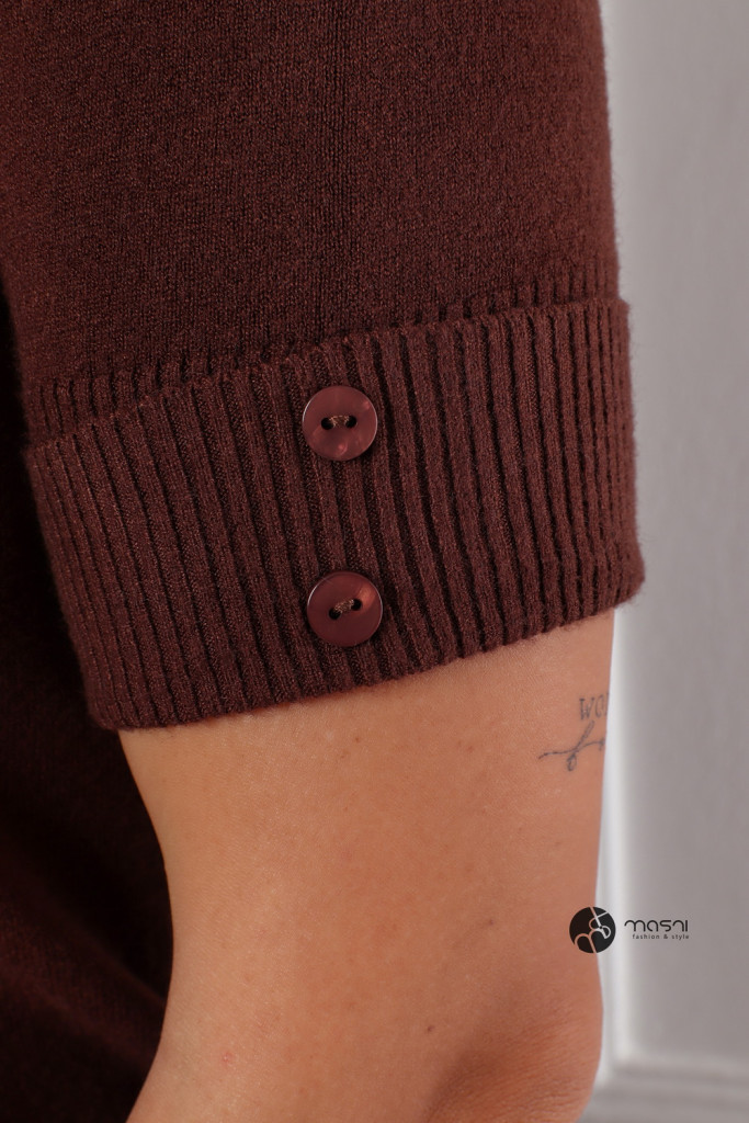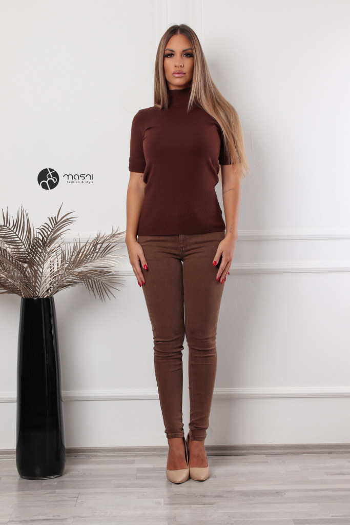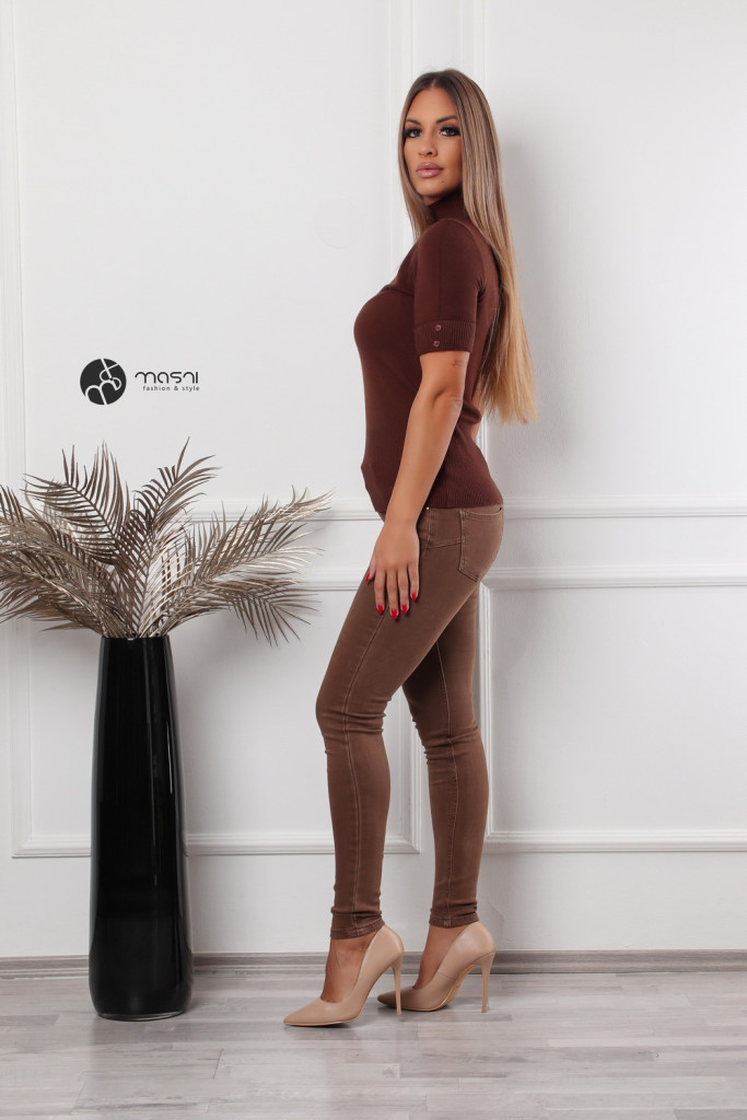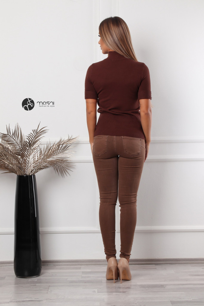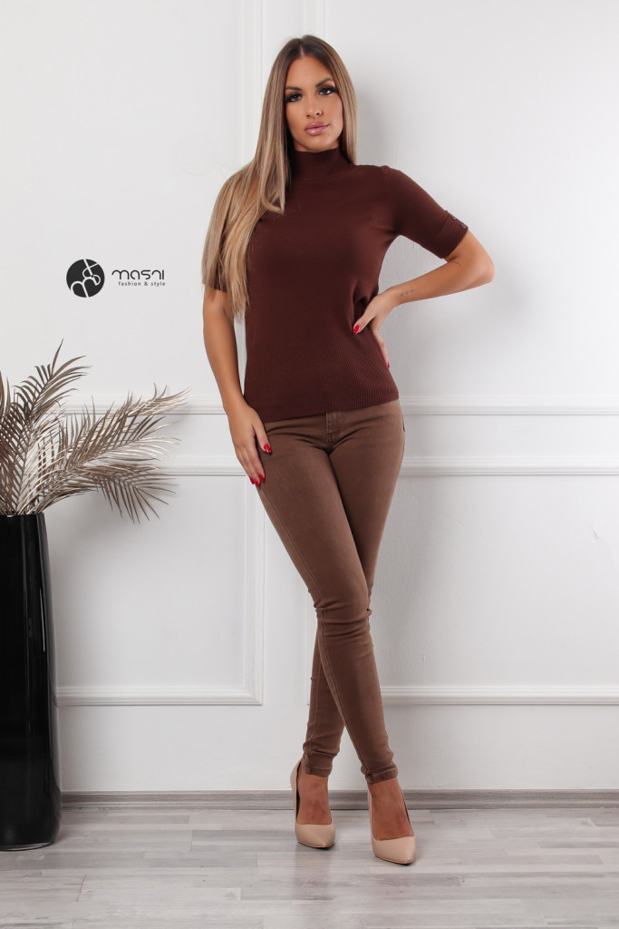 Magas nyakú, rövid ujjú, ujján gombokkal díszített, kötött egyszínű felső
