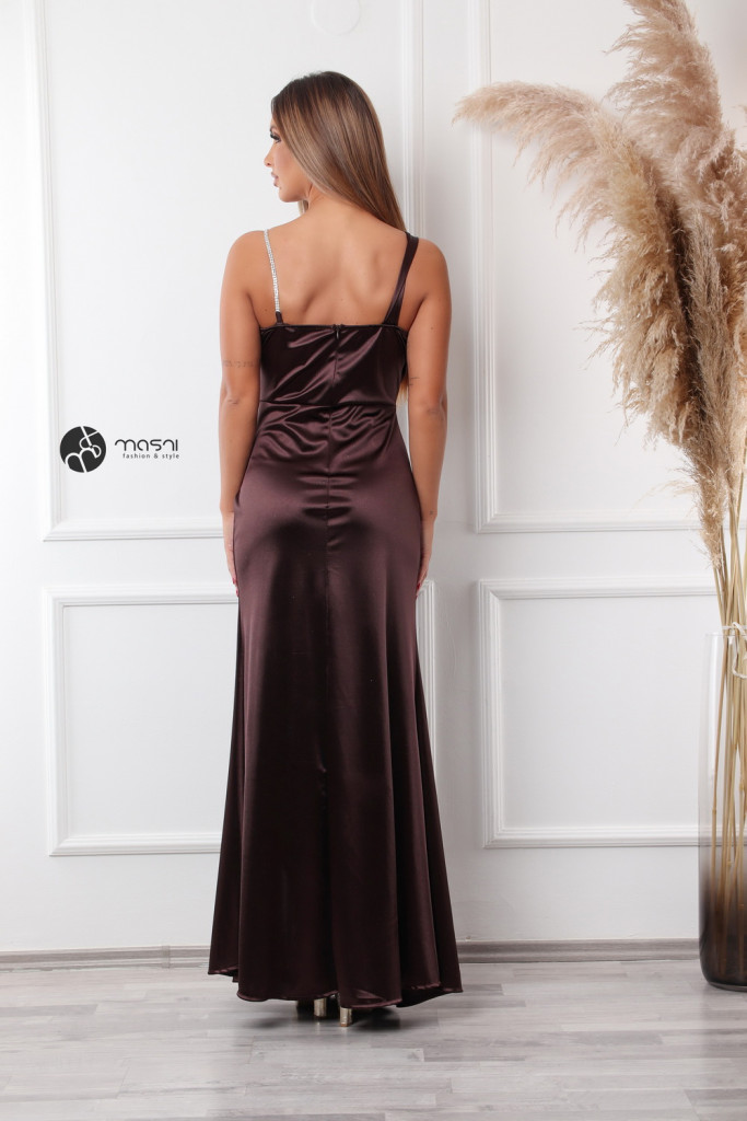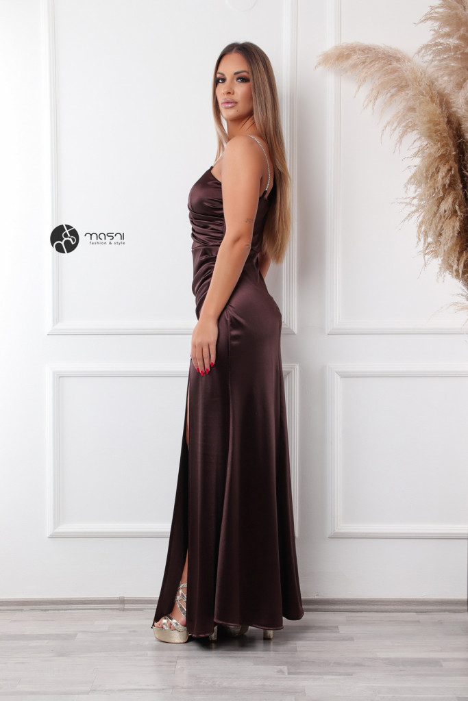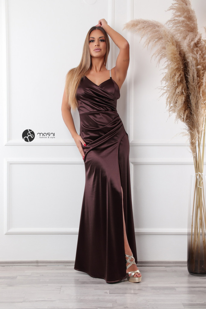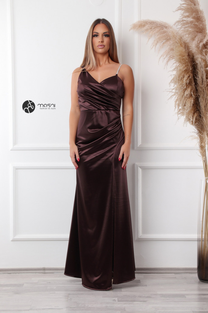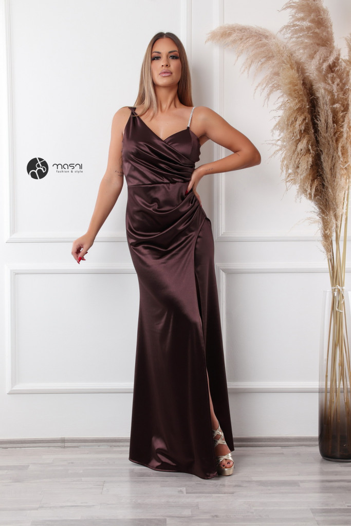 Dekoltált, egyik vállán strasszköves pántos, oldalt húzott egyszínű szatén maxi ruha