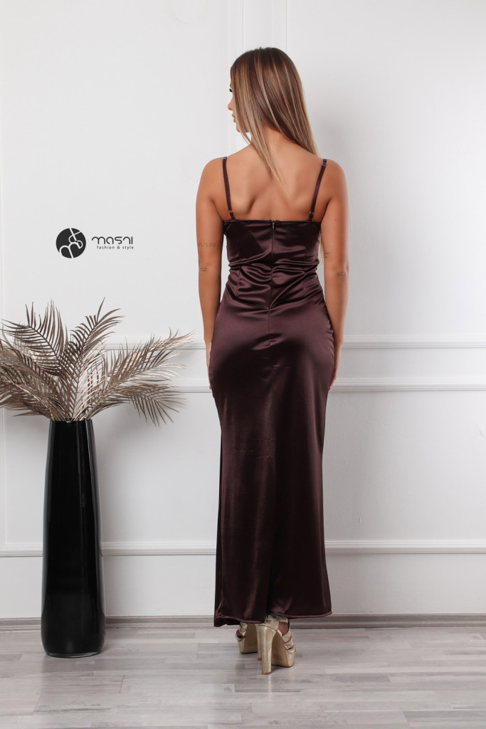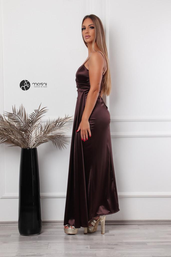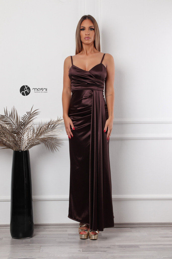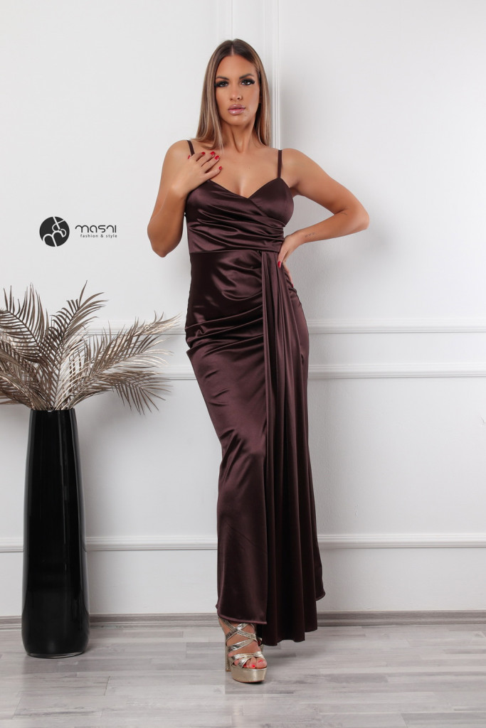 Gumipántos, dekoltált, oldalt húzott egyszínű szatén maxi ruha
