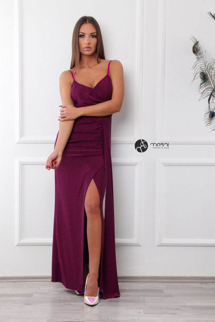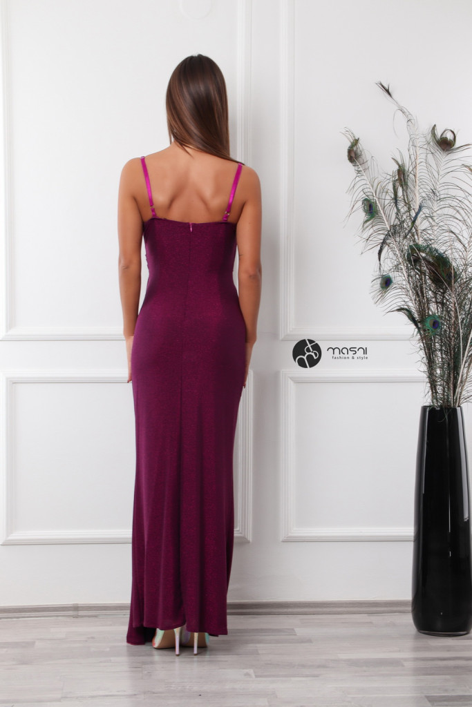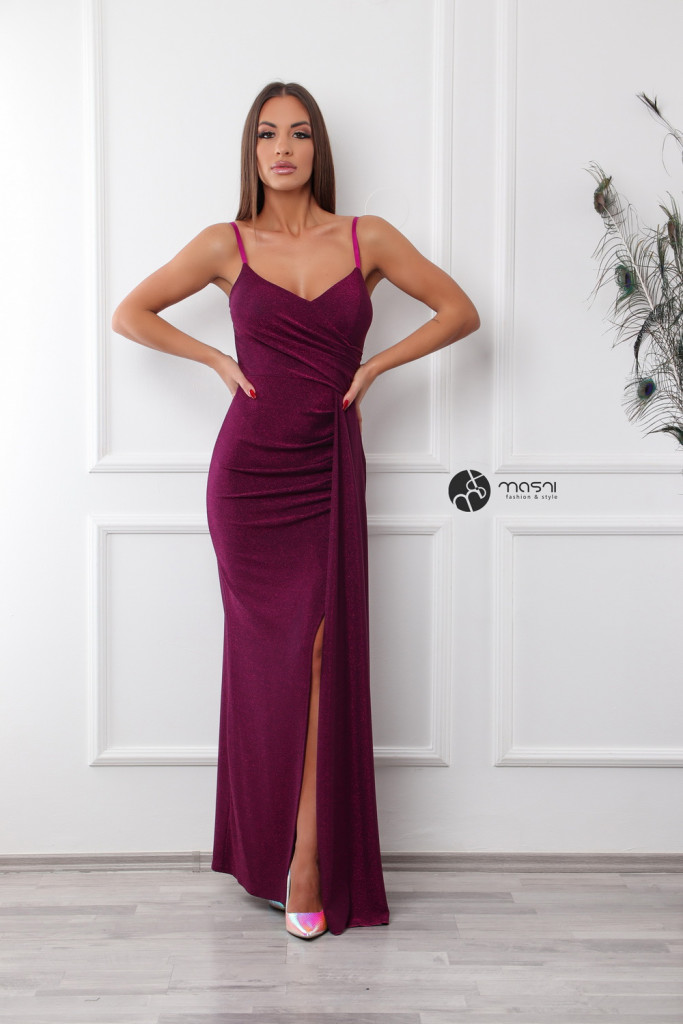 Gumipántos, dekoltált, oldalt húzott csillogó anyagú maxi ruha