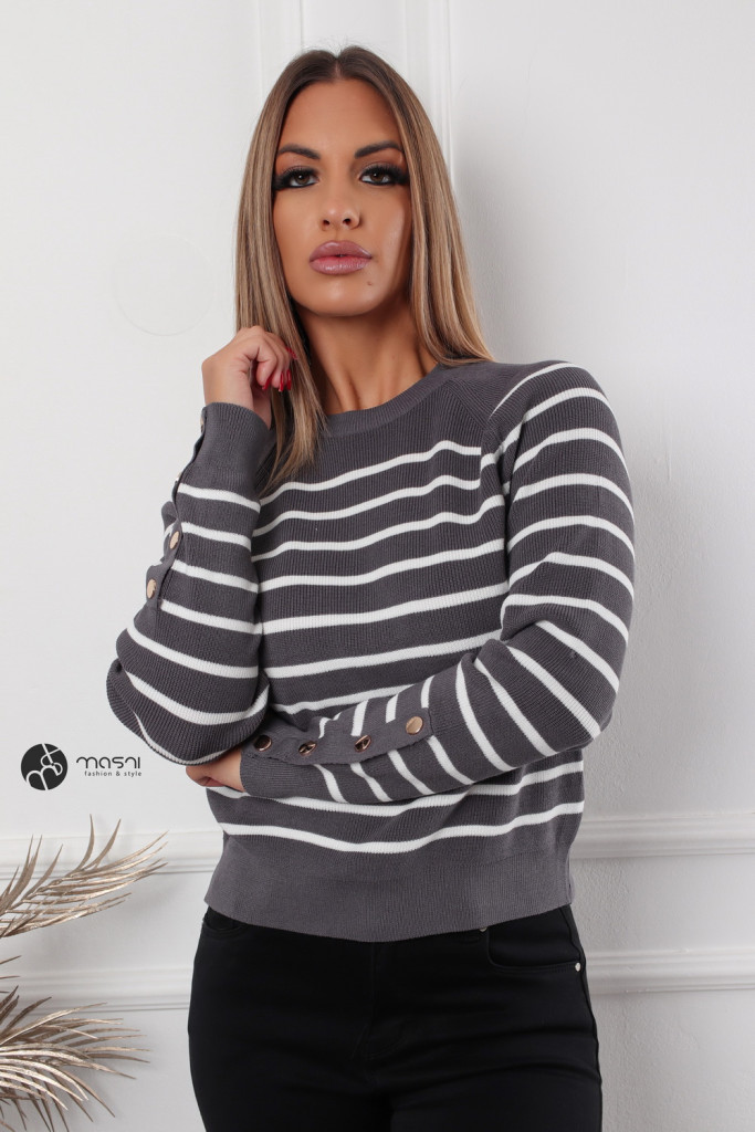 Hosszú ujjú, kerek nyakú, ujján arany gombos csíkos kötött pulcsi
