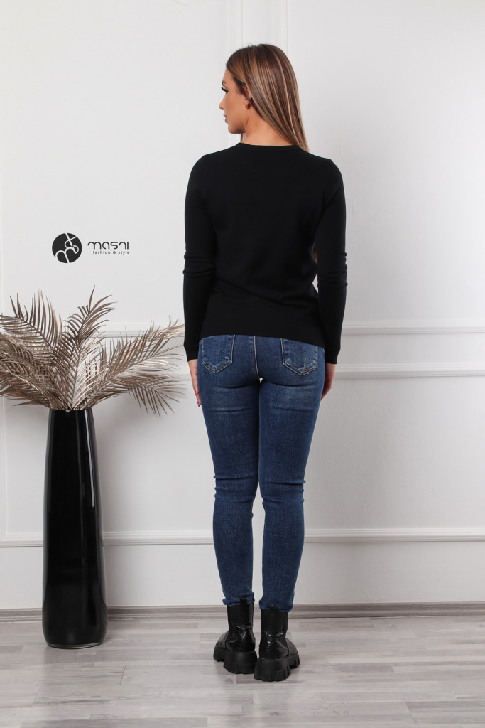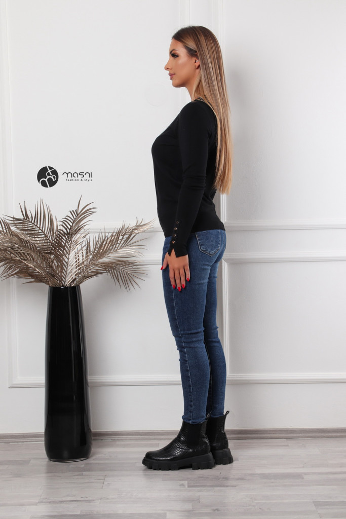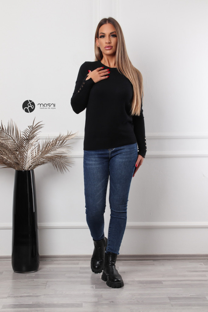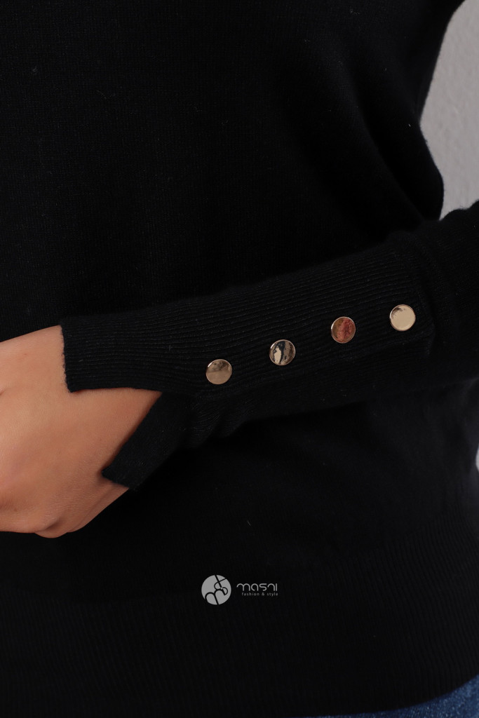 Hosszú ujjú, kerek nyakú, ujján arany gombos egyszínű kötött pulcsi