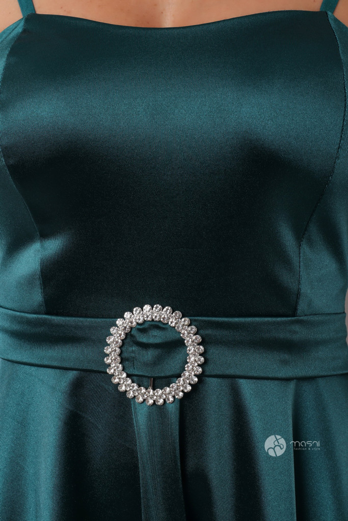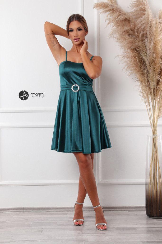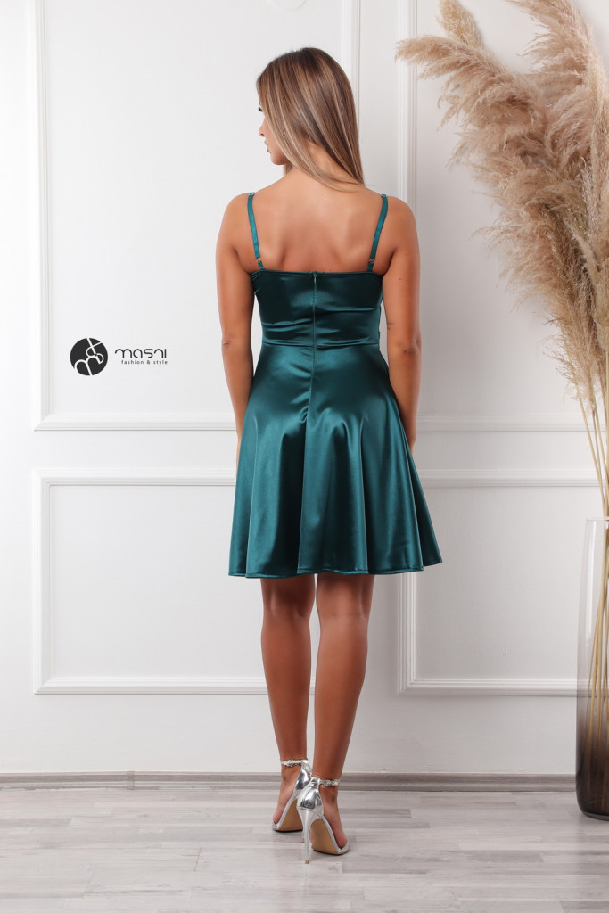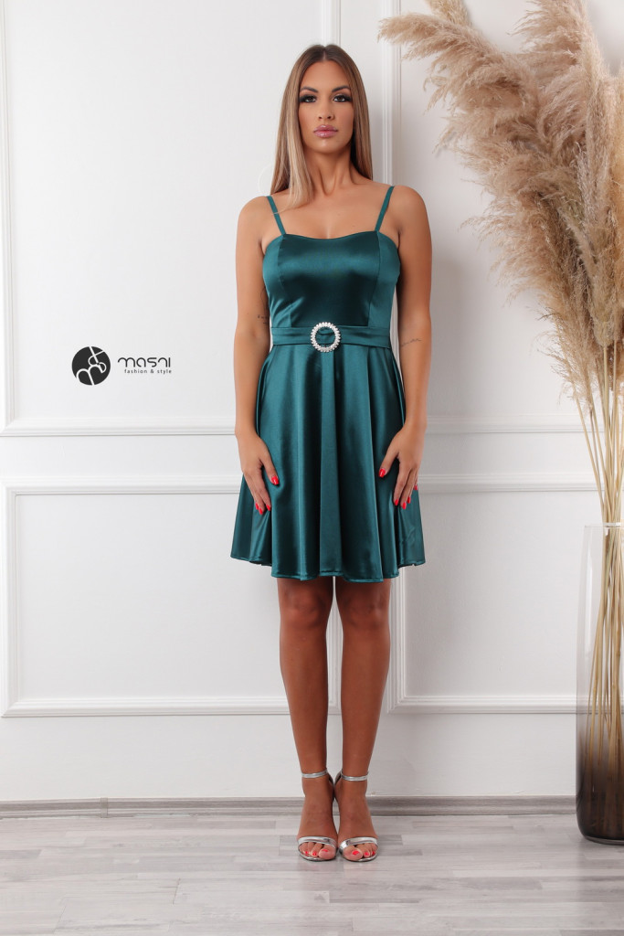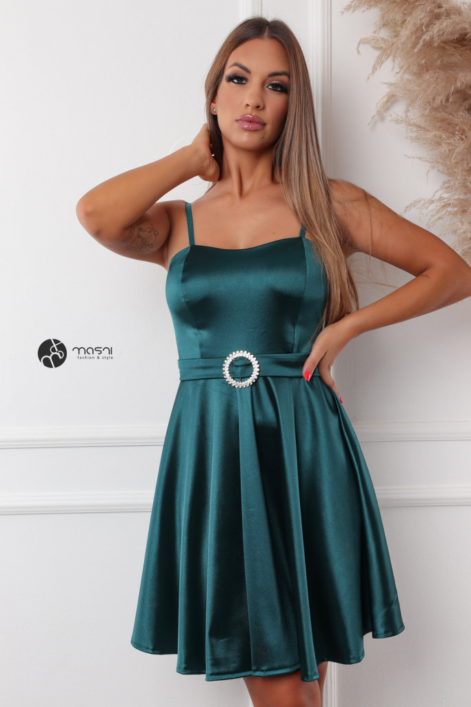 Ujjatlan, gumipántos, derékban köves kellékes, egyszínű szatén rövid ruha
